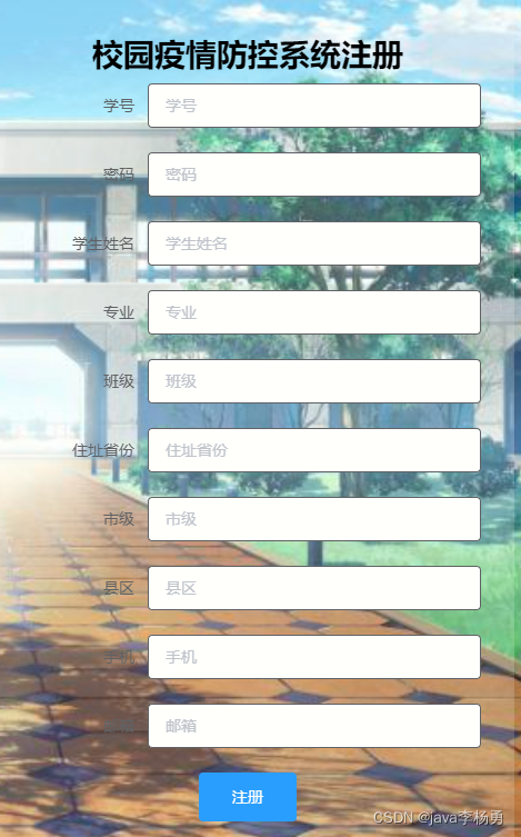 登录注册:学生注册/登陆,通过填写学号、密码、学生姓名、性别、头像、专业、班级、住址省份、市级、县级、手机、邮箱等信息,输入完成后选择注册即可进入校园疫情防控系统,通过学号密码登陆