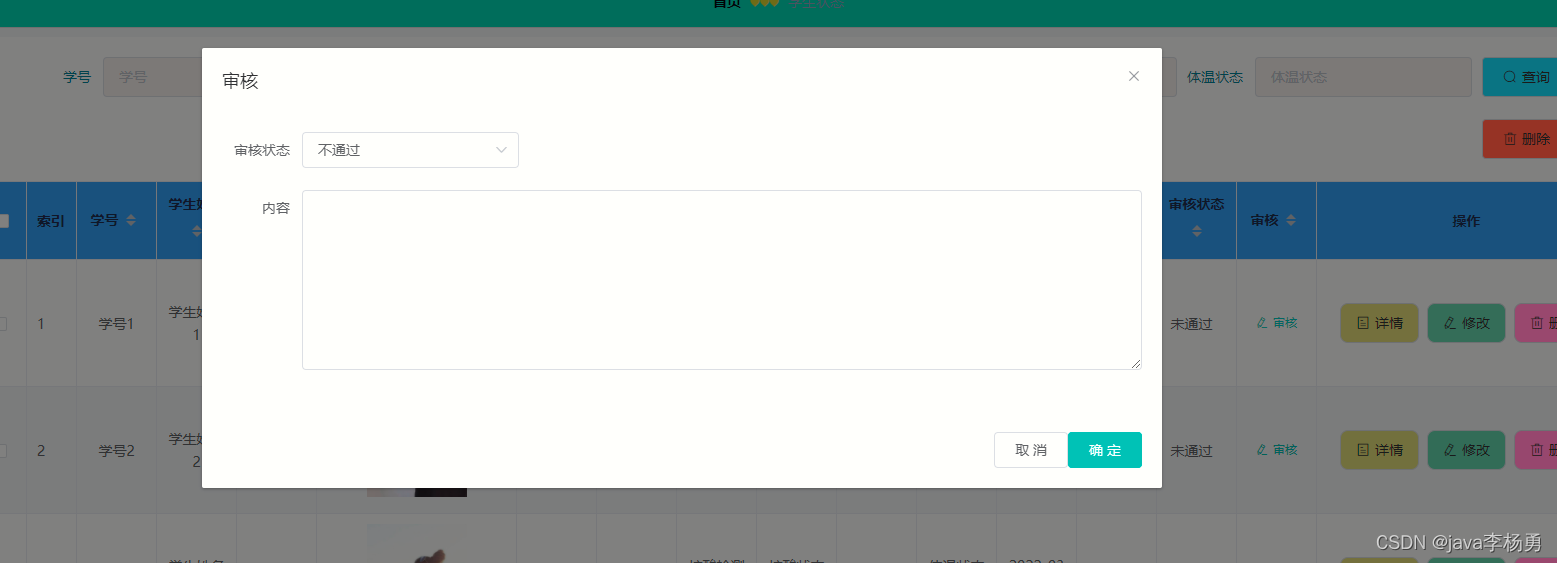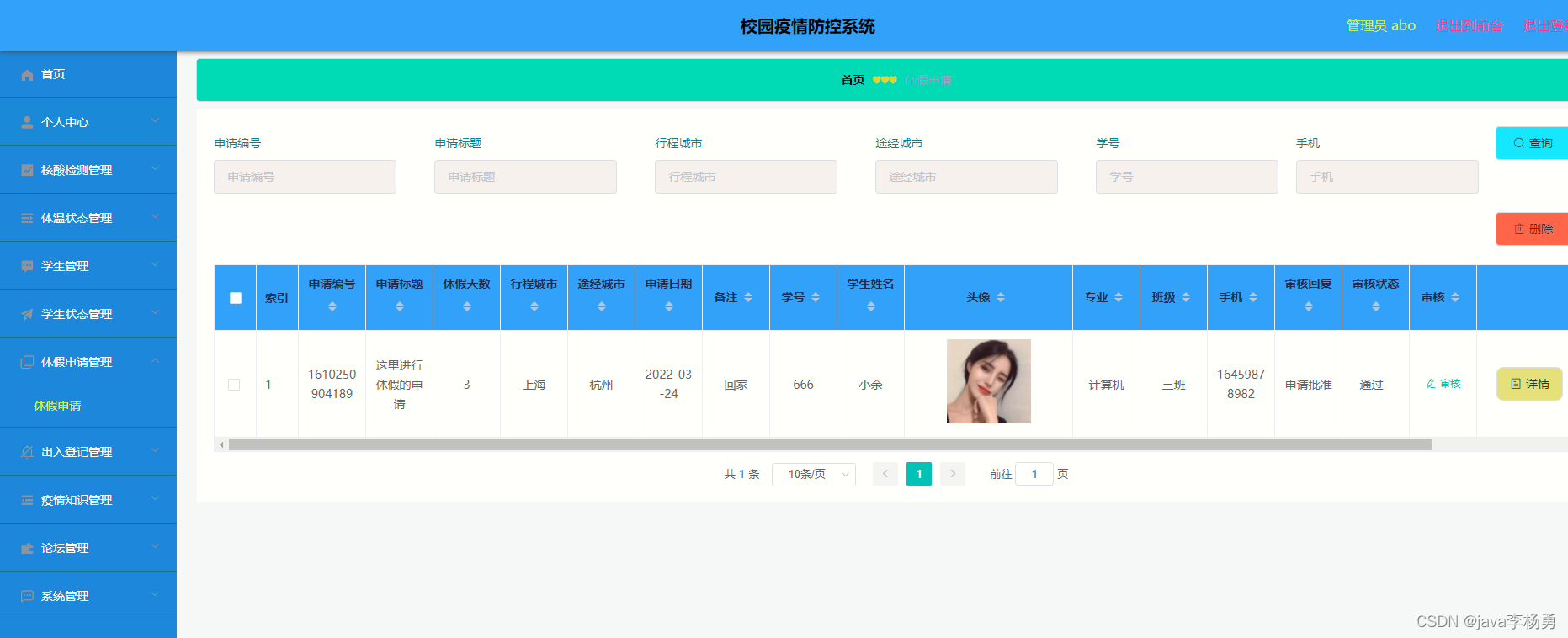 出入登记:通过出入登记管理内容列表可以获取登记标题、登陆类型、登记时间、备注、学号、学生姓名、性别、头像、实时体温、手机、班级、专业、审核回复、审核状态、审核等信息可进行详情、修改、删除或查看等