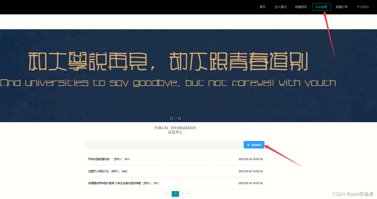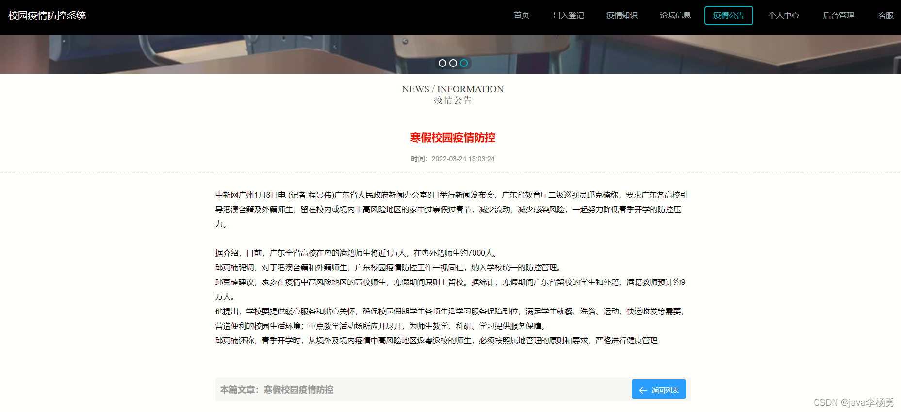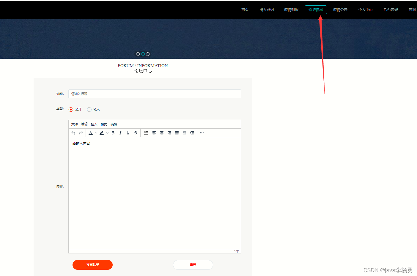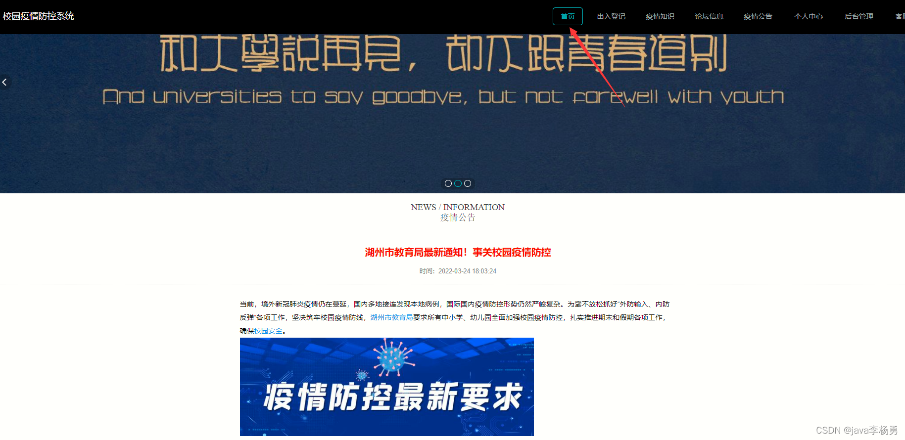 用户首页:通过内容列表可以获取网站首页、出入登记、疫情知识、论坛信息、疫情公告、个人中心、后台管理、客服等信息操作内容,如图所示
