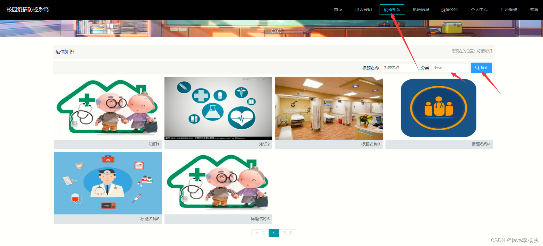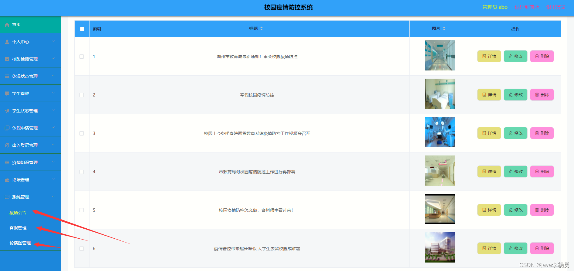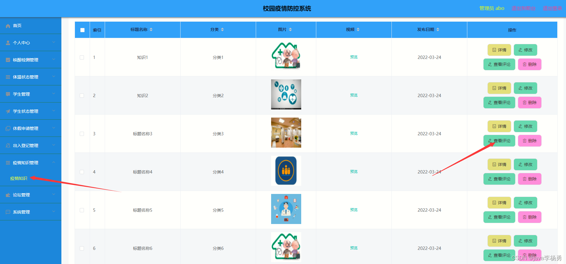 疫情知识:通过疫情知识内容列表可以获取标题名称、分类、图片、视频、发布日期等信息可进行详情、修改、删除或查看等操作