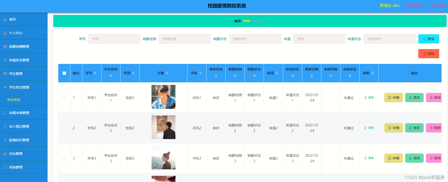 管理员首页,管理员进入校园疫情防控系统查看个人中心、核酸检测管理、体温状态管理、学生管理、学生状态管理、休假申请管理、出入登记管理、疫情知识管理、论坛管理、系统管理操作