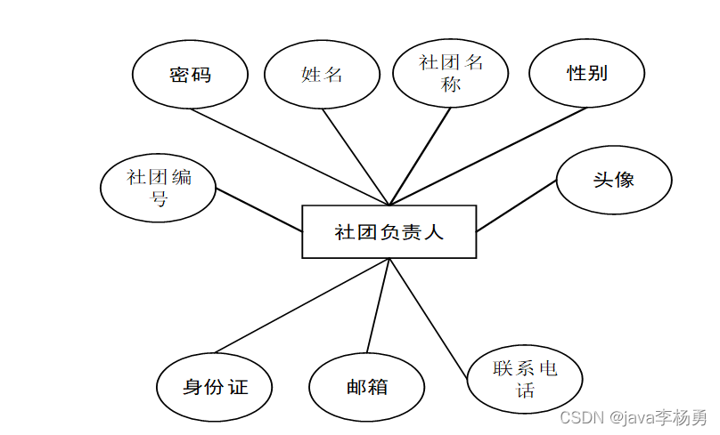 社团负责人管理实体属性主要包括社团编号、密码、姓名、社团名称、性别、头像、联系电、话邮箱、身份证等属性。社团负责人管理实体属性图如图所示。