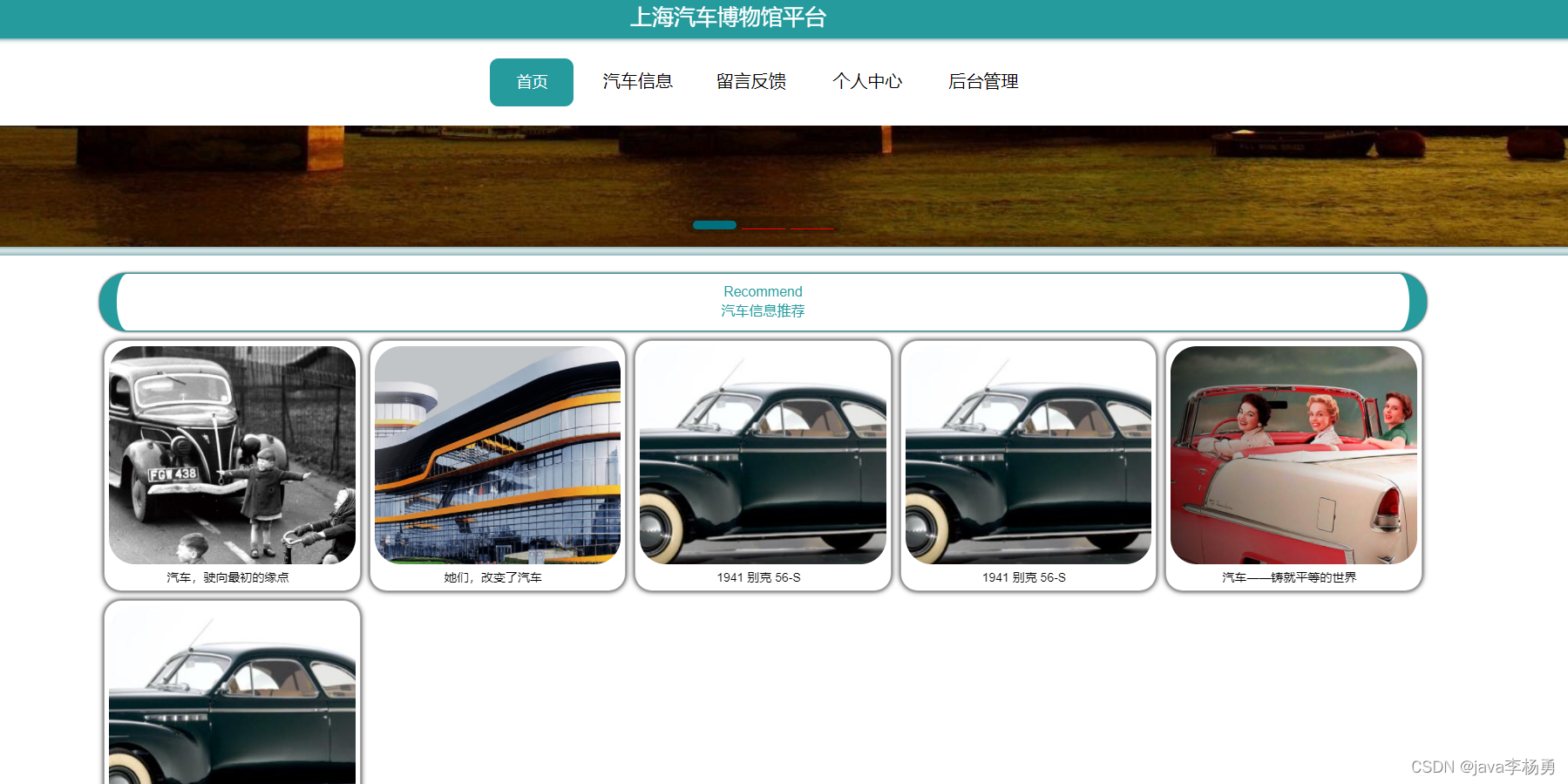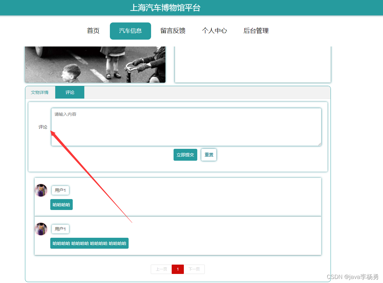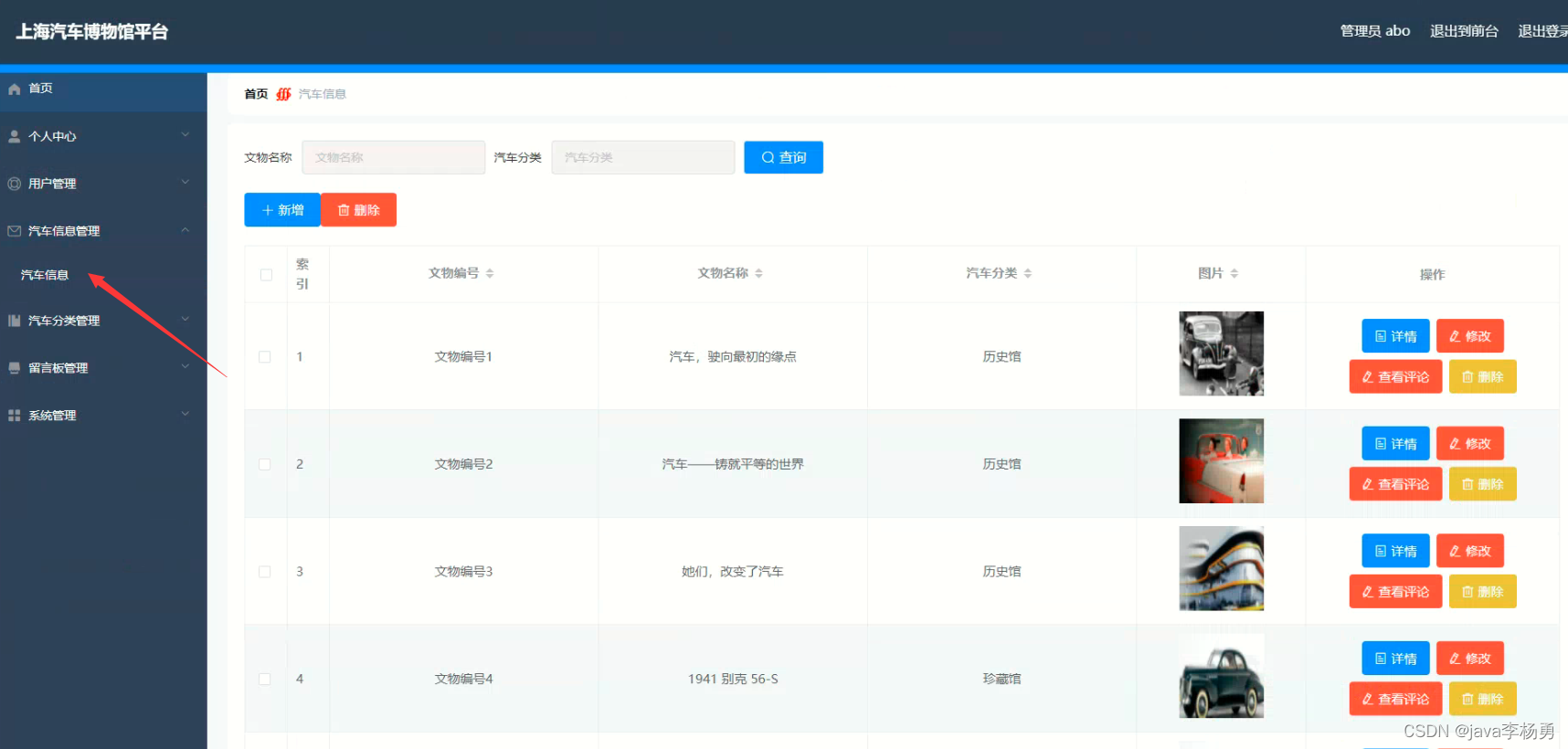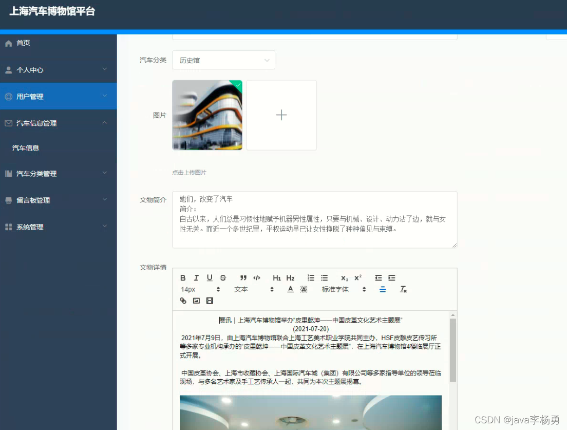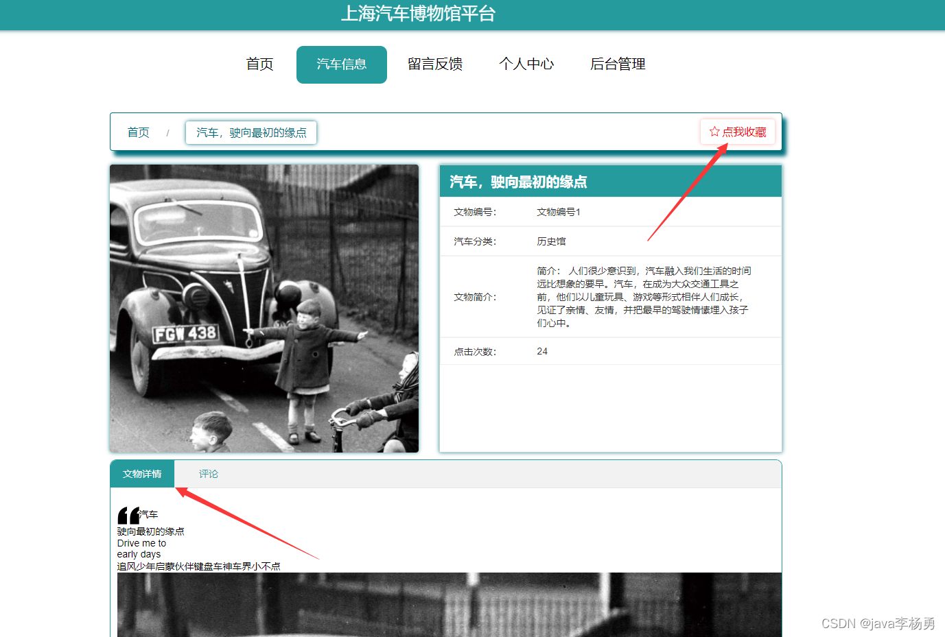 汽车信息:汽车信息页面,用户可以查看汽车编号、汽车名称、汽车分类、图片、汽车简介、文物详情等内容,用户可以进行收藏和评论,如下图所示