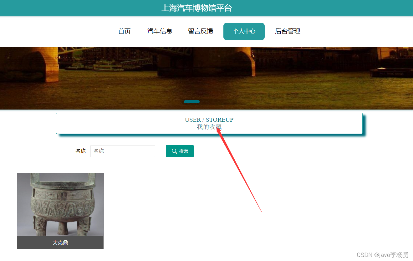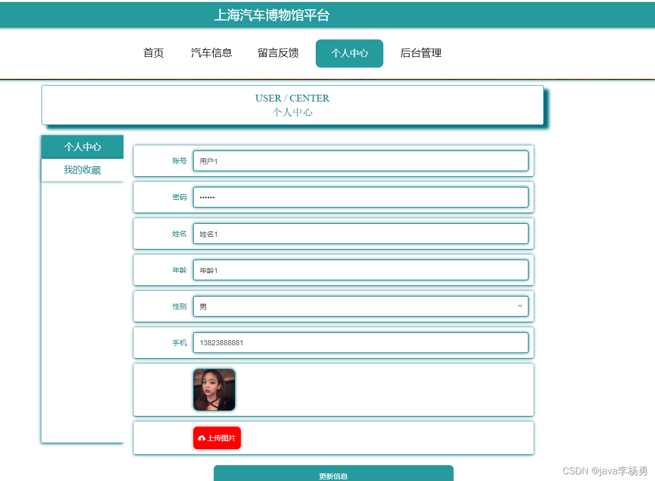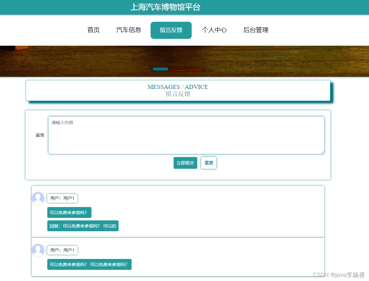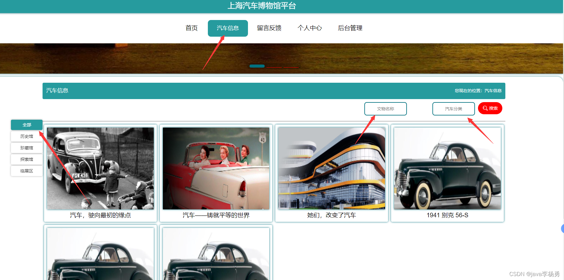 汽车信息:汽车信息页面,用户可以查看汽车编号、汽车名称、汽车分类、图片、汽车简介、文物详情等内容,用户可以进行收藏和评论,如下图所示