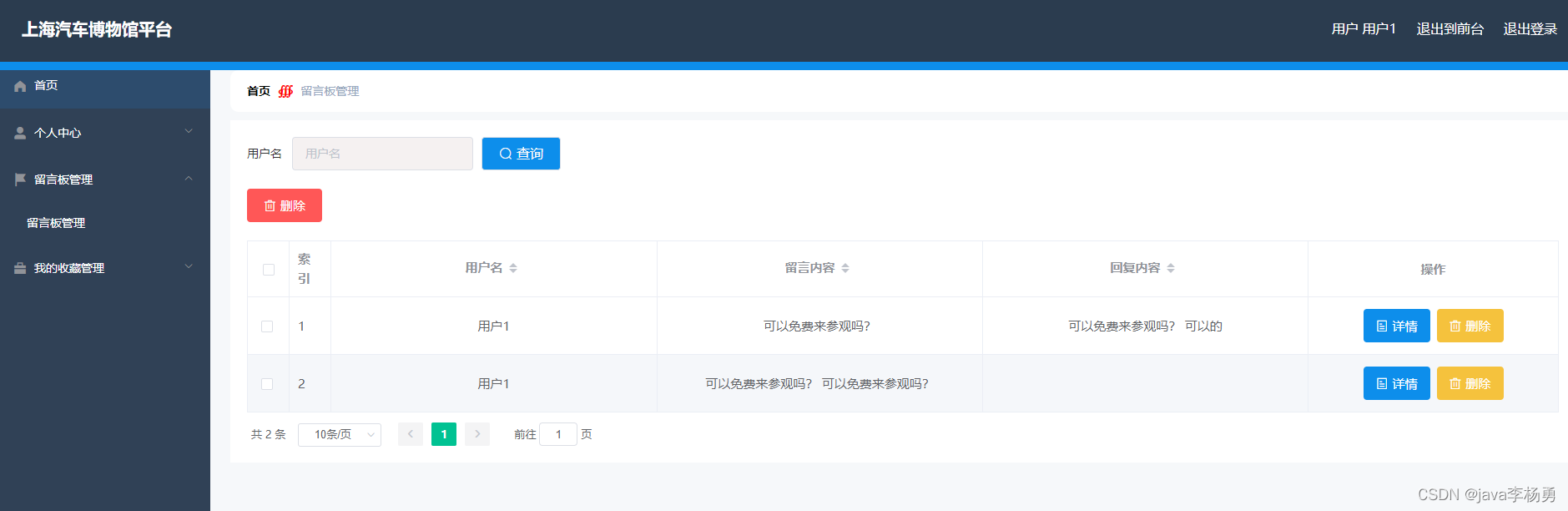 管理员后台管理:管理员登录进入博物馆交流平台可以查看个人中心、用户管理、博物馆信息管理、文物信息管理、文物分类管理、留言板管理、系统管理等内容,并进行相关操作,如图5-8所示