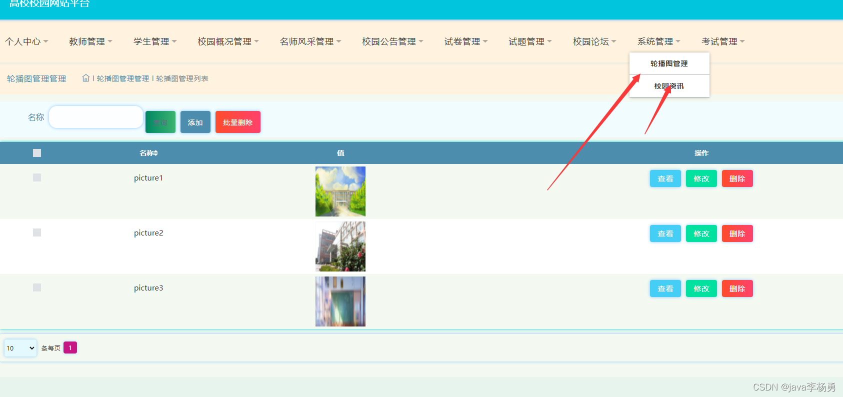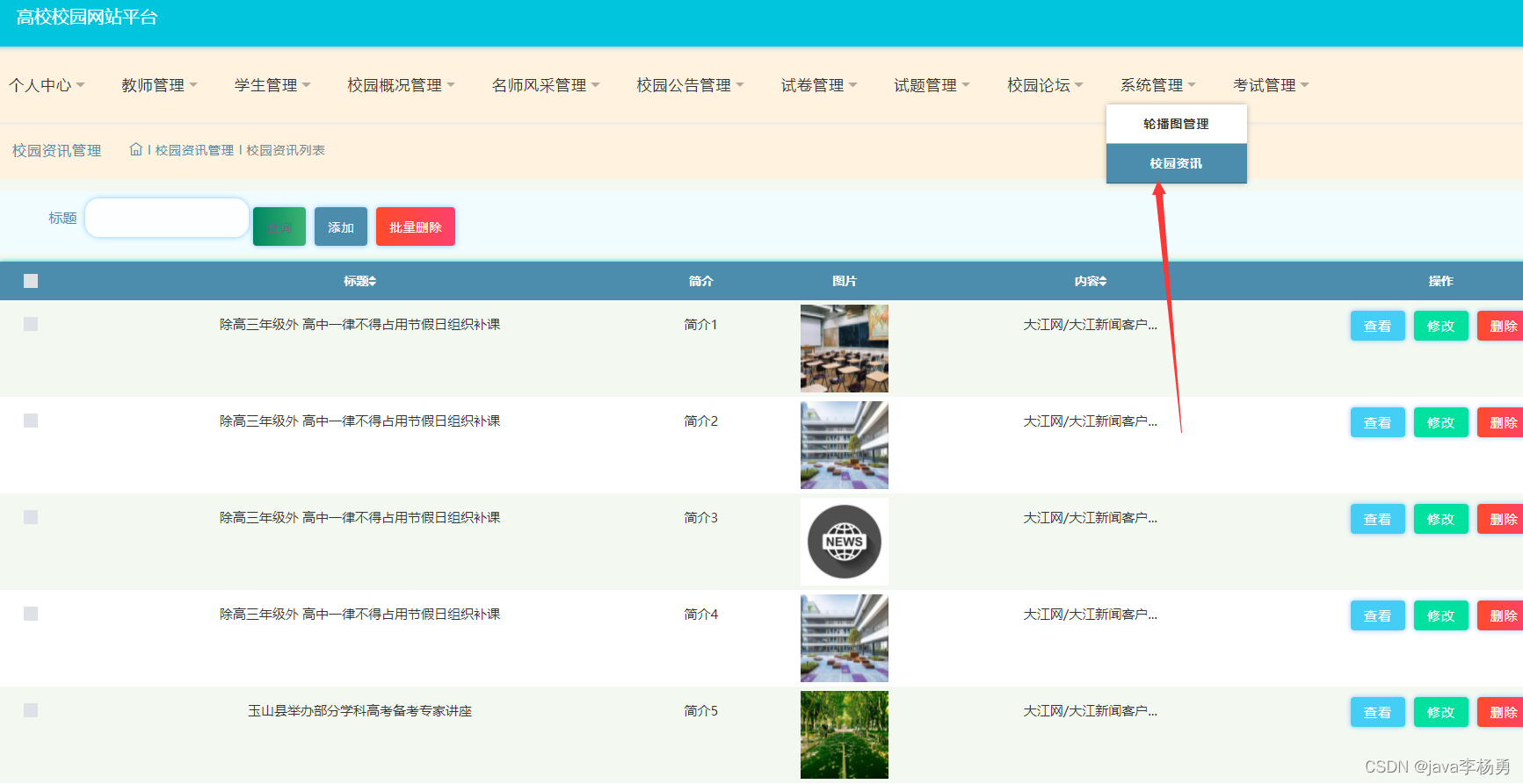 系统轮播图和校园资讯等信息: