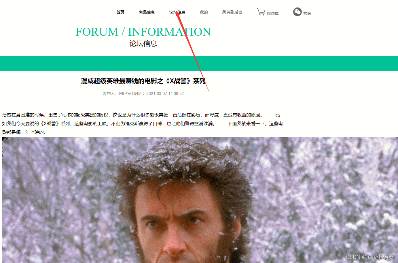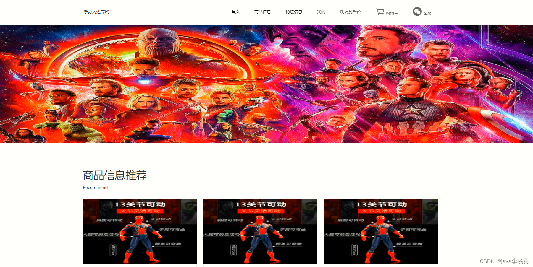首页主要功能介绍:商品信息、论坛信息、我的、跳转到后台、购物车客服等信息管理功能