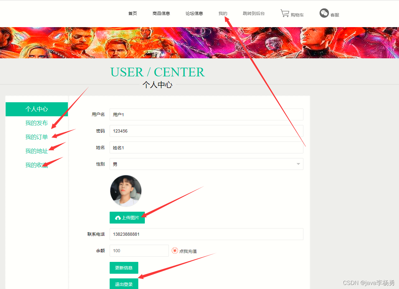 在我的个人中心可以查看我的发布、我的订单、我的地址修改以及我的收藏模块和个人信息模块