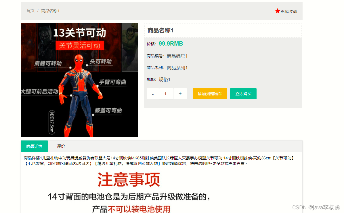 商品详情:可加入购物车、修改数量、立即购买和收藏商品