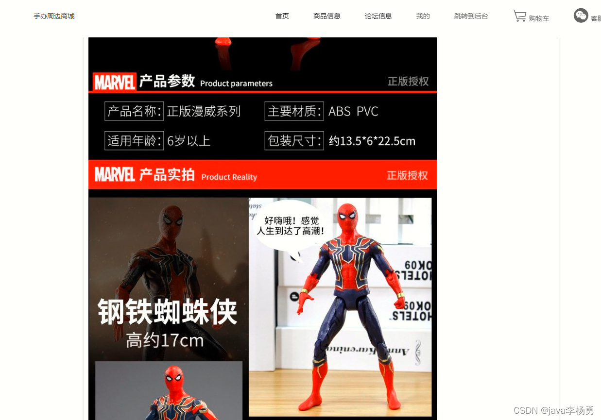 本漫威系列手办周边商城系统主要功能设计为实现管理员;个人中心、系统公告管理、用户管理、商品系列管理、商品信息管理、订单评价管理、论坛管理、系统管理、订单管理,用户;个人中心、订单评价管理、我的收藏管理、订单管理,前台首页;首页、商品信息、论坛信息、我的、跳转到后台、购物车客服等信息管理功能。系统操作流程如下: