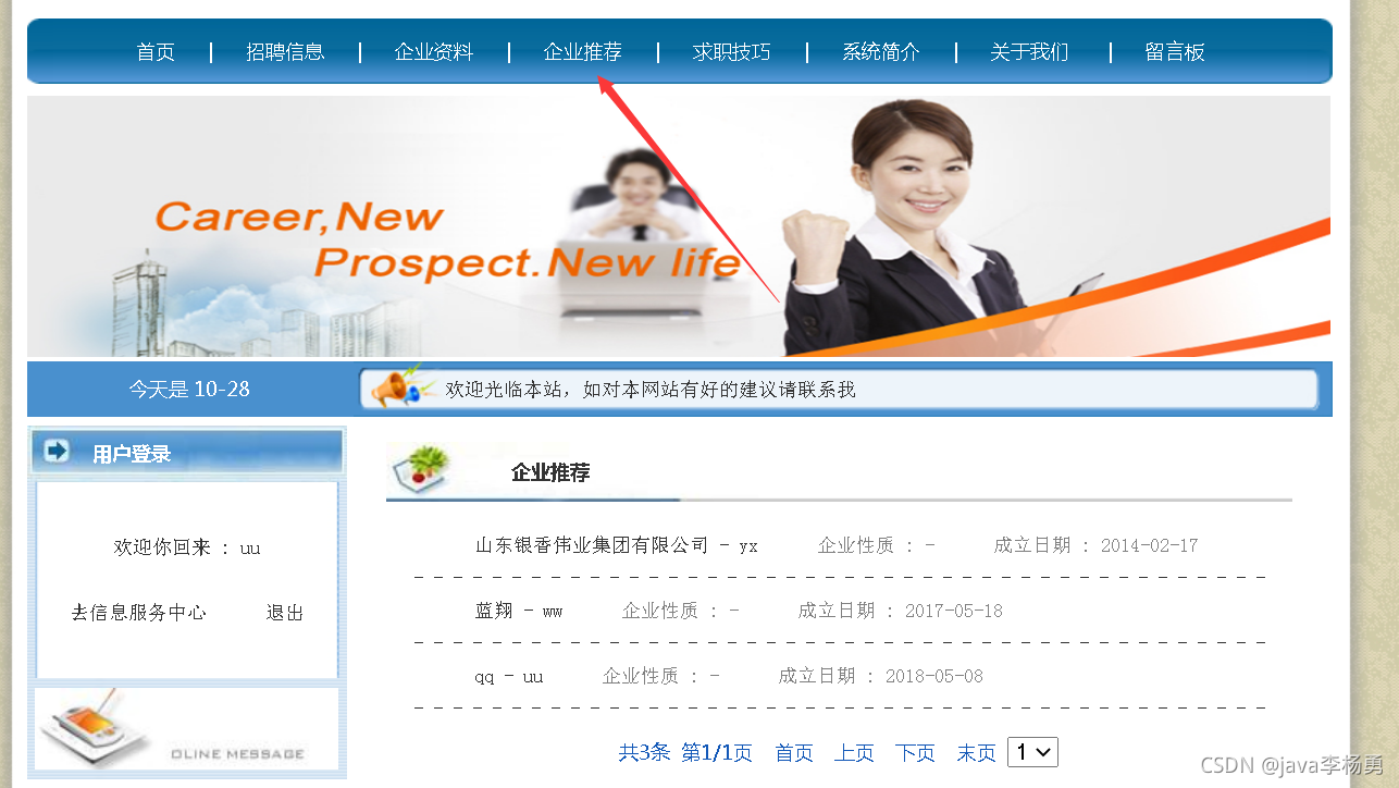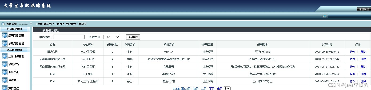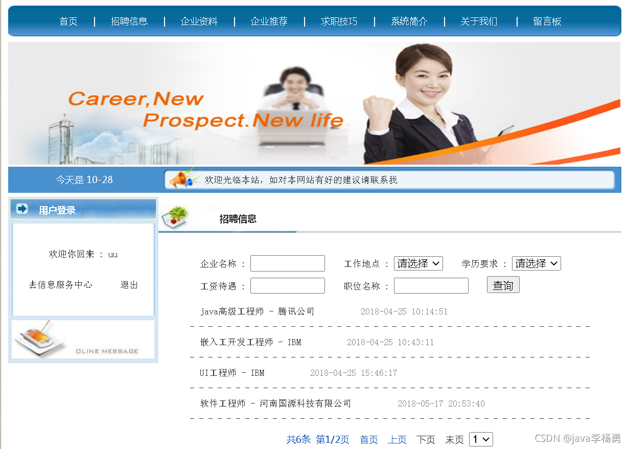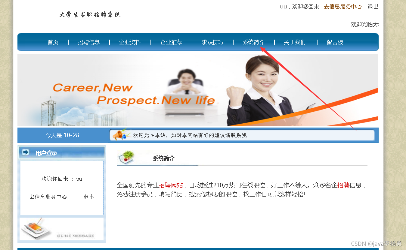 都能满足你的需求。原始Jsp、SSM、SpringBoot、以及HTML+CSS+JS页面设计, web大学生网页设计作业源码等等都可以参考得到解决。话不多说直接拿一个学生求职招聘管理系统来举例