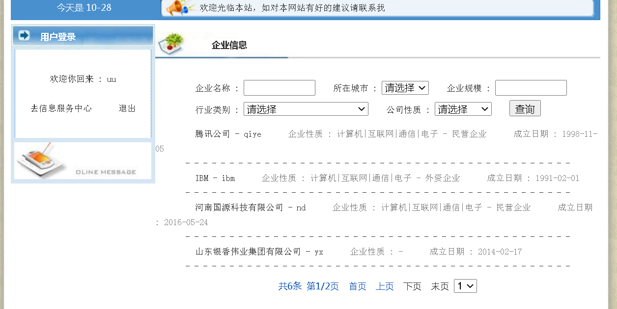 public class MainCtrl extends HttpServlet {public MainCtrl() {super();}public void destroy() {super.destroy(); // Just puts "destroy" string in log// Put your code here}public void doGet(HttpServletRequest request, HttpServletResponse response)throws ServletException, IOException {this.doPost(request, response);}public void go(String url,HttpServletRequest request, HttpServletResponse response){try {request.getRequestDispatcher(url).forward(request, response);} catch (ServletException e) {e.printStackTrace();} catch (IOException e) {e.printStackTrace();}}public void gor(String url,HttpServletRequest request, HttpServletResponse response){try {response.sendRedirect(url);} catch (IOException e) {// TODO Auto-generated catch blocke.printStackTrace();}}public void doPost(HttpServletRequest request, HttpServletResponse response)throws ServletException, IOException {response.setContentType("text/html");PrintWriter out = response.getWriter();HttpSession session = request.getSession();HashMap user = (HashMap)session.getAttribute("admin");String ac = request.getParameter("ac");if(ac==null)ac="";CommDAO dao = new CommDAO();String date = Info.getDateStr();String today = date.substring(0,10);String tomonth = date.substring(0,7);if(ac.equals("mlogin")){ String username = request.getParameter("uname");String password = request.getParameter("upass"); List<HashMap> list = dao.select("select * from sysuser where uname='"+ username + "'");if (list.size() == 1) {HashMap map = list.get(0);List<HashMap> ulist = dao.select("select * from sysuser where uname='"+ username + "' and upass='" + password+ "'");if (ulist.size() == 1&& password.equals(map.get("upass").toString())) {request.getSession().setAttribute("admin", map);gor("/jsp_qzzp_sys/index.jsp", request, response);} else {request.setAttribute("error", "");go("/index.jsp", request, response);}} else {request.setAttribute("error", "");go("/index.jsp", request, response);}}//修改密码if(ac.equals("uppass")){String olduserpass = request.getParameter("olduserpass");String userpass = request.getParameter("userpass");String copyuserpass = request.getParameter("copyuserpass"); user = dao.getmap(Info.getUser(request).get("id").toString(), "sysuser");if(!(((String)user.get("upass")).equals(olduserpass))){request.setAttribute("error", "");go("/admin/uppass.jsp", request, response);}else{String id = (String)user.get("id");String sql = "update sysuser set upass='"+userpass+"' where id="+id;dao.commOper(sql);request.setAttribute("suc", "");go("/admin/uppass.jsp", request, response);}}if(ac.equals("uploaddoc")){try {String filename="";request.setCharacterEncoding("utf-8");RequestContext requestContext = new ServletRequestContext(request);if(FileUpload.isMultipartContent(requestContext)){DiskFileItemFactory factory = new DiskFileItemFactory();factory.setRepository(new File(request.getRealPath("/upfile/")+"/"));ServletFileUpload upload = new ServletFileUpload(factory);upload.setSizeMax(100*1024*1024);List items = new ArrayList();items = upload.parseRequest(request);FileItem fileItem = (FileItem) items.get(0);if(fileItem.getName()!=null && fileItem.getSize()!=0){if(fileItem.getName()!=null && fileItem.getSize()!=0){File fullFile = new File(fileItem.getName());filename = Info.generalFileName(fullFile.getName());File newFile = new File(request.getRealPath("/upfile/")+"/" + filename);try {fileItem.write(newFile);} catch (Exception e) {e.printStackTrace();}}else{}}}go("/js/uploaddoc.jsp?docname="+filename, request, response);} catch (Exception e1) {e1.printStackTrace();}}public void init() throws ServletException {// Put your code here}public static void main(String[] args) {System.out.println(new CommDAO().select("select * from mixinfo"));}}