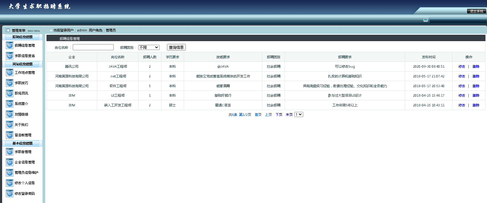 管理员: 登录注册、招聘信息的发布和管理、企业资料管理、推荐企业管理、求职技巧管理、系统简介管理、关于我们管理、留言板管理、工作地点管理、求职者信息管理、企业信息管理、个人信息管理和修改密码等具体功能设计