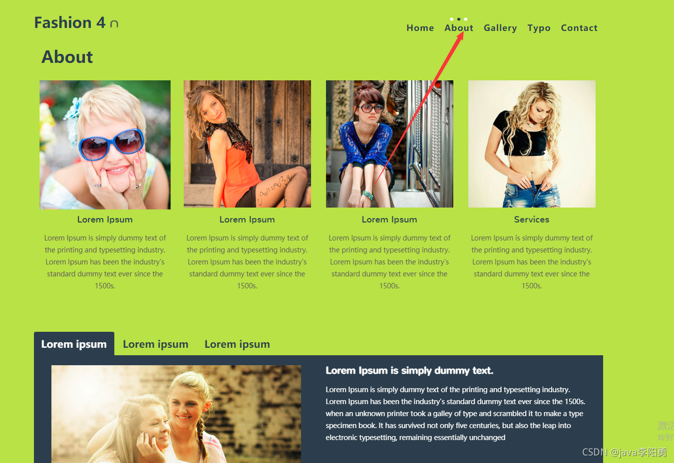 <body><div class="header-top"><nav class="navbar navbar-default"><div class="container"><!-- Brand and toggle get grouped for better mobile display --><div class="navbar-header"><button type="button" class="navbar-toggle collapsed" data-toggle="collapse" data-target="#bs-example-navbar-collapse-1" aria-expanded="false"><span class="sr-only">Toggle navigation</span><span class="icon-bar"></span><span class="icon-bar"></span><span class="icon-bar"></span></button><div class="logo"><a href="index.html"><h1>fashion 4 <span class="hand-log"></span></h1></a></div></div><!-- Collect the nav links, forms, and other content for toggling --><div class="collapse navbar-collapse" id="bs-example-navbar-collapse-1"><ul class="nav navbar-nav navbar-right nav-dsgn "><li><a href="index.html" class="active">Home</a></li><li><a href="about.html">About</a></li><li><a href="gallery.html">Gallery</a></li><li><a href="typography.html">Typo</a></li><li><a href="contact.html">Contact</a></li></ul></div><!-- /.navbar-collapse --><div class="clearfix"></div></div><!-- /.container-fluid --></nav></div>