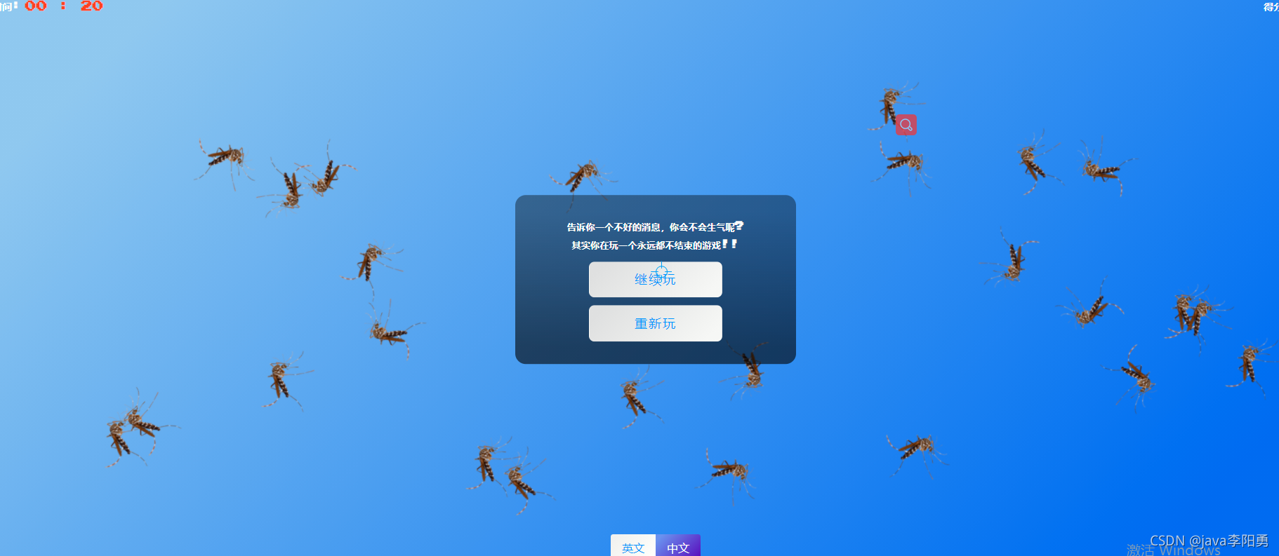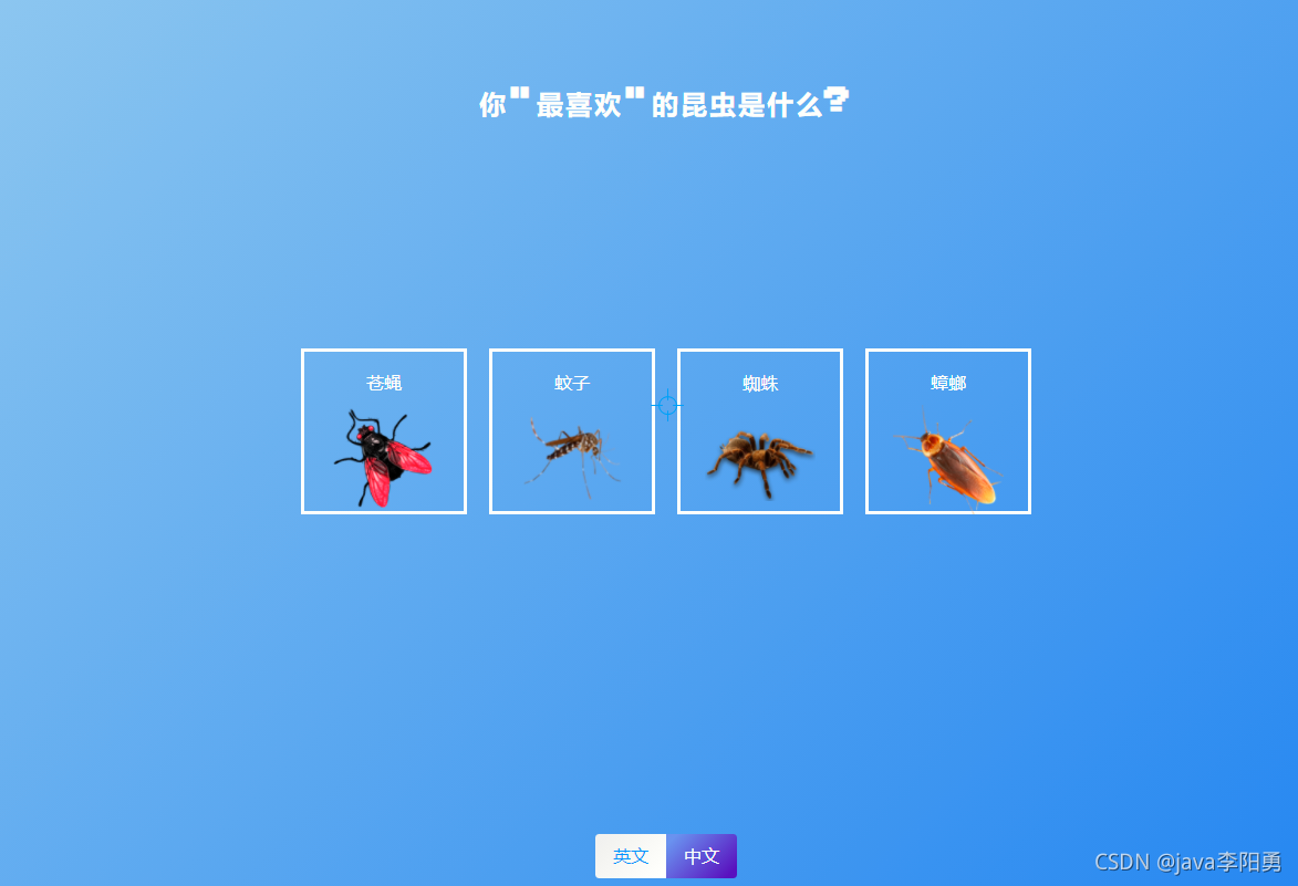 </head><body><div id="tab-container" class="tab-container"><div class="tab-item active" data-value="en">en</div><div class="tab-item" data-value="zh">zh</div></div><div class="screen"><h1 id="firstTitle">Catch The Insect</h1><button id="play" class="btn play">Play Game</button></div><div class="screen"><h2 id="secondTitle">What is your "favorite" insect?</h2><ul id="inspect-list" class="inspect-list"><li><div class="choose-btn"><p>Fly</p><img src="img/fly_PNG3946.png" alt="fly"></div></li><li><div class="choose-btn"><p>mosquito</p><img src="img/mosquito_PNG18175.png" alt="mosquito" /></div></li><li><div class="choose-btn"><p>spider</p><img src="img/spider_PNG12.png" alt="spider" /></div></li><li><div class="choose-btn"><p>roach</p><img src="img/roach_PNG12163.png" alt="roach" /></div></li></ul></div><div class="screen game-container" id="game-container"><h3 id="time" class="time">Time:<span>00:00</span></h3><h3 class="score" id="score">Score:<span>0</span></h3><h5 id="message" class="message">Tell you a bad news, will you be angry? <br> Actually you are playing a game that never ends!!<button class="btn continue-btn" id="continue">Continue Play</button><button class="btn restart-btn" id="restart">Restart Play</button></h5></div>
