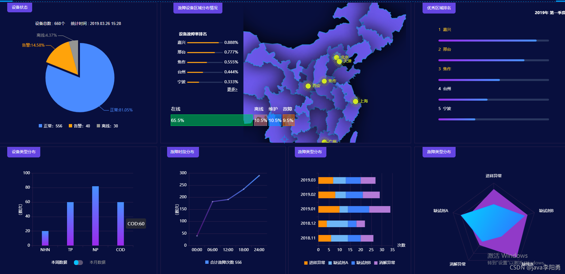 <div class="main clearfix"><div class="main-left"><div class="border-container containertop"><h5 class="name-title tile-size-color">设备状态</h5><div id="radar"><div class="radarkong"><p class="tile-size-color">设备总数 :<span class="Totalequipment"> 660个</span>统计时间 :<span> 2019.03.26 15:28</span></p></div><div class="pie-chart" id="pie-chart"></div><ul class="SiteStatusList"><li><i class="Statusnormal Statussame"></i>正常:<span>556</span></li><li><i class="Statusemergency Statussame"></i>告警:<span>40</span></li><li><i class="StatusOffline Statussame"></i>离线:<span>30</span></li></ul></div> </div><div class="border-container containerbottom"><div class="name-title tile-size-color">设备类型分布</div><div class="graduateyear"><div class="bar-chart" id="bar-chart"></div><ul class="SiteStatusList"><li>本周数据</li><li class="DataSwitch"><i class="ThisweekData Datasame" onClick="DataSwitch(this,1)"></i><i class="ThisweekData" onClick="DataSwitch(this,2)"></i></li><li class="Defaultgray">本月数据</li></ul></div></div></div><div class="main-middle"><div class="border-container containertop"><div class="name-title tile-size-color">故障设备区域分布情况</div><div id="mapadd"><div class="mapleft"><div class="progress2-chart" id="progress2-chart"></div><a href="###" class="progressMore">更多></a></div><div class="map-chart" id="map-chart"></div><ul class="Devicestatus-List"><li class="Online2">65.5%<span class="DevicestatusName">在线</span></li><li class="Online2">10.5%<span class="DevicestatusName">离线</span></li><li class="Online2">10.5%<span class="DevicestatusName">维护</span></li><li class="Online2">9.5%<span class="DevicestatusName">故障</span></li></ul></div></div><div class="border-container containerbottom borderno-container"><ul class="teacher-pie clearfix"><li class="teacherList"><div class="name-title tile-size-color">故障时段分布</div><div id="courserate"><div class="line-chart" id="line-chart"></div><ul class="SiteStatusList"><li><i class="Statusnormal Statussame"></i>合计故障次数 <span>556</span></li></ul></div></li><li class="teacherList"><div class="name-title tile-size-color">故障类型分布</div><div class="bars-chart" id="bars-chart"></div></li></ul></div></div><div class="main-right"><div class="border-container containertop"><div class="name-title tile-size-color">优秀区域排名</div><div class="progress1-chart" id="progress1-chart"></div></div><div class="border-container containerbottom"><div class="name-title tile-size-color">故障类型分布</div><div id="radar-chart" class="radar-chart"></div></div></div>