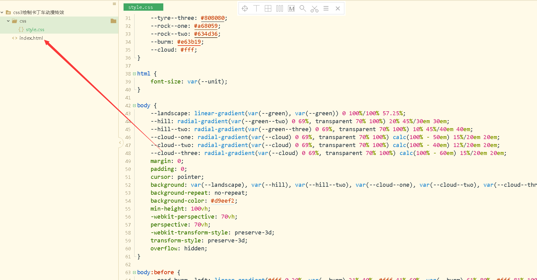 }body {--landscape: linear-gradient(var(--green), var(--green)) 0 100%/100% 57.25%;--hill: radial-gradient(var(--green--two) 0 69%, transparent 70% 100%) 20% 45%/30em 30em;--hill--two: radial-gradient(var(--green--three) 0 69%, transparent 70% 100%) 10% 45%/40em 40em;--cloud--one: radial-gradient(var(--cloud) 0 69%, transparent 70% 100%) calc(100% - 50em) 15%/20em 20em;--cloud--two: radial-gradient(var(--cloud) 0 69%, transparent 70% 100%) calc(100% - 40em) 12%/20em 20em;--cloud--three: radial-gradient(var(--cloud) 0 69%, transparent 70% 100%) calc(100% - 60em) 15%/20em 20em;margin: 0;padding: 0;cursor: pointer;background: var(--landscape), var(--hill), var(--hill--two), var(--cloud--one), var(--cloud--two), var(--cloud--three);background-repeat: no-repeat;background-color: #d9eef2;min-height: 100vh;-webkit-perspective: 70vh;perspective: 70vh;-webkit-transform-style: preserve-3d;transform-style: preserve-3d;overflow: hidden;