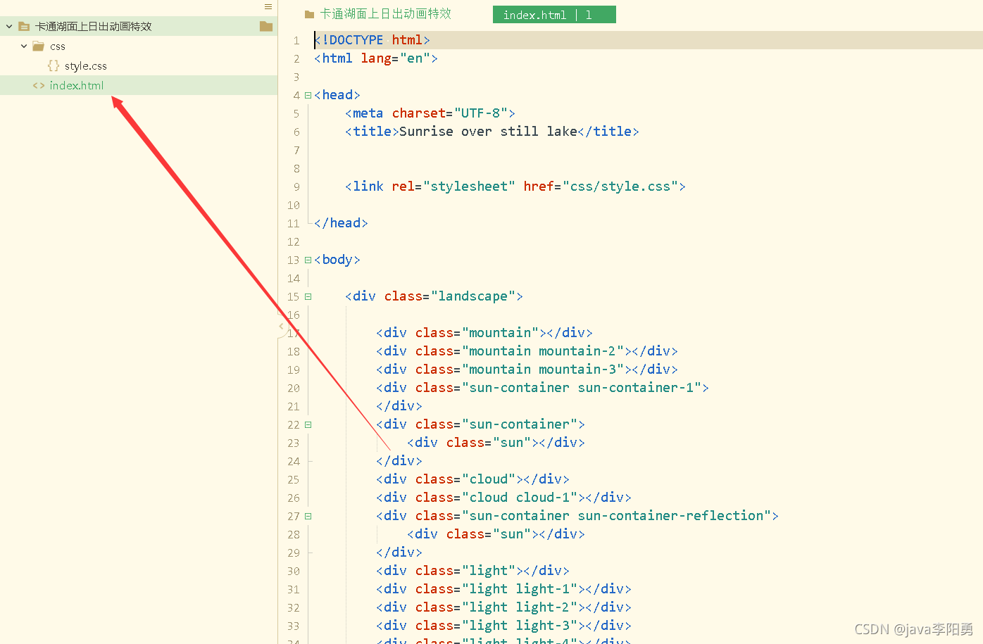 <html lang="en"><head><meta charset="UTF-8"><title>Sunrise over still lake</title><link rel="stylesheet" href="css/style.css"></head><body><div class="landscape"><div class="mountain"></div><div class="mountain mountain-2"></div><div class="mountain mountain-3"></div><div class="sun-container sun-container-1"></div><div class="sun-container"><div class="sun"></div></div><div class="cloud"></div><div class="cloud cloud-1"></div><div class="sun-container sun-container-reflection"><div class="sun"></div></div><div class="light"></div><div class="light light-1"></div><div class="light light-2"></div><div class="light light-3"></div><div class="light light-4"></div><div class="light light-5"></div><div class="light light-6"></div><div class="light light-7"></div><div class="water"></div><div class="splash"></div><div class="splash delay-1"></div><div class="splash delay-2"></div><div class="splash splash-4 delay-2"></div><div class="splash splash-4 delay-3"></div><div class="splash splash-4 delay-4"></div><div class="splash splash-stone delay-3"></div><div class="splash splash-stone splash-4"></div><div class="splash splash-stone splash-5"></div><div class="lotus lotus-1"></div><div class="lotus lotus-2"></div><div class="lotus lotus-3"></div><div class="front"><div class="stone"></div><div class="grass"></div><div class="grass grass-1"></div><div class="grass grass-2"></div><div class="reed"></div><div class="reed reed-1"></div></div></div></body></html>源码获取