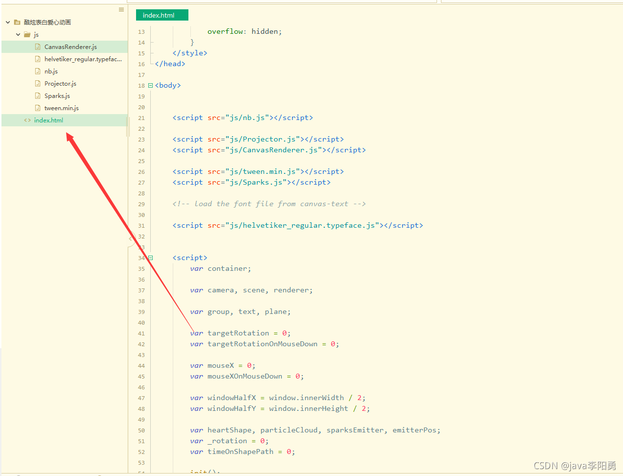 <script>var container;var camera, scene, renderer;var group, text, plane;var targetRotation = 0;var targetRotationOnMouseDown = 0;var mouseX = 0;var mouseXOnMouseDown = 0;var windowHalfX = window.innerWidth / 2;var windowHalfY = window.innerHeight / 2;var heartShape, particleCloud, sparksEmitter, emitterPos;var _rotation = 0;var timeOnShapePath = 0;init();animate();function init() {container = document.createElement('div');document.body.appendChild(container);//相机camera = new THREE.PerspectiveCamera(50, window.innerWidth / window.innerHeight, 1, 1000);camera.position.set(0, 150, 800);//场景scene = new THREE.Scene();group = new THREE.Group();scene.add(group);// Get text from hashvar string = "xiaorui";var hash = document.location.hash.substr(1);if (hash.length !== 0) {string = hash;}var text3d = new THREE.TextGeometry(string, {size: 80,height: 20,curveSegments: 2,font: "helvetiker"});text3d.computeBoundingBox();var centerOffset = -0.5 * (text3d.boundingBox.max.x - text3d.boundingBox.min.x);var textMaterial = new THREE.MeshBasicMaterial({color: Math.random() * 0xffffff,overdraw: 0.5});text = new THREE.Mesh(text3d, textMaterial);// Potentially, we can extract the vertices or faces of the text to generate particles too.// Geo > Vertices > Positiontext.position.x = centerOffset;text.position.y = 100;text.position.z = 0;text.rotation.x = 0;text.rotation.y = Math.PI * 2;group.add(text);particleCloud = new THREE.Object3D(); // Just a groupparticleCloud.y = 800;group.add(particleCloud);// Create Particle Systems// Heartvar x = 0,y = 0;heartShape = new THREE.Shape();heartShape.moveTo(x + 25, y + 25);heartShape.bezierCurveTo(x + 25, y + 25, x + 20, y, x, y);heartShape.bezierCurveTo(x - 30, y, x - 30, y + 35, x - 30, y + 35);heartShape.bezierCurveTo(x - 30, y + 55, x - 10, y + 77, x + 25, y + 95);heartShape.bezierCurveTo(x + 60, y + 77, x + 80, y + 55, x + 80, y + 35);heartShape.bezierCurveTo(x + 80, y + 35, x + 80, y, x + 50, y);heartShape.bezierCurveTo(x + 35, y, x + 25, y + 25, x + 25, y + 25);var hue = 0;var hearts = function(context) {context.globalAlpha = 0.5;var x = 0,y = 0;context.scale(0.05, -0.05); // Scale so canvas render can redraw within boundscontext.beginPath();// From http://blog.burlock.org/html5/130-pathscontext.bezierCurveTo(x + 2.5, y + 2.5, x + 2.0, y, x, y);context.bezierCurveTo(x - 3.0, y, x - 3.0, y + 3.5, x - 3.0, y + 3.5);context.bezierCurveTo(x - 3.0, y + 5.5, x - 1.0, y + 7.7, x + 2.5, y + 9.5);context.bezierCurveTo(x + 6.0, y + 7.7, x + 8.0, y + 5.5, x + 8.0, y + 3.5);context.bezierCurveTo(x + 8.0, y + 3.5, x + 8.0, y, x + 5.0, y);context.bezierCurveTo(x + 3.5, y, x + 2.5, y + 2.5, x + 2.5, y + 2.5);context.fill();context.lineWidth = 0.5; //0.05context.stroke();}var setTargetParticle = function() {var material = new THREE.SpriteCanvasMaterial({program: hearts});material.color.setHSL(hue, 1, 0.75);hue += 0.001;if (hue > 1)hue -= 1;particle = new THREE.Sprite(material);particle.scale.x = particle.scale.y = Math.random() * 40 + 40;particleCloud.add(particle);return particle;};var onParticleCreated = function(p) {p.target.position.copy(p.position);};var onParticleDead = function(particle) {particle.target.visible = false;particleCloud.remove(particle.target);};sparksEmitter = new SPARKS.Emitter(new SPARKS.SteadyCounter(160));emitterpos = new THREE.Vector3();sparksEmitter.addInitializer(new SPARKS.Position(new SPARKS.PointZone(emitterpos)));sparksEmitter.addInitializer(new SPARKS.Lifetime(0, 2));sparksEmitter.addInitializer(new SPARKS.Target(null, setTargetParticle));sparksEmitter.addInitializer(new SPARKS.Velocity(new SPARKS.PointZone(new THREE.Vector3(0, -50, 10))));// TOTRY Set velocity to move away from centroidsparksEmitter.addAction(new SPARKS.Age());//sparksEmitter.addAction(new SPARKS.Accelerate(0.2));sparksEmitter.addAction(new SPARKS.Move());sparksEmitter.addAction(new SPARKS.RandomDrift(50, 50, 2000));sparksEmitter.addCallback("created", onParticleCreated);sparksEmitter.addCallback("dead", onParticleDead);sparksEmitter.addCallback("updated", function(particle) {particle.target.position.copy(particle.position);});sparksEmitter.start();// End Particlesrenderer = new THREE.CanvasRenderer();renderer.setClearColor(0xf0f0f0);renderer.setPixelRatio(window.devicePixelRatio);renderer.setSize(window.innerWidth, window.innerHeight);container.appendChild(renderer.domElement);document.addEventListener('mousedown', onDocumentMouseDown, false);document.addEventListener('touchstart', onDocumentTouchStart, false);document.addEventListener('touchmove', onDocumentTouchMove, false);//window.addEventListener('resize', onWindowResize, false);}function onWindowResize() {windowHalfX = window.innerWidth / 2;windowHalfY = window.innerHeight / 2;camera.aspect = window.innerWidth / window.innerHeight;camera.updateProjectionMatrix();renderer.setSize(window.innerWidth, window.innerHeight);}//document.addEventListener('mousemove', onDocumentMouseMove, false);function onDocumentMouseDown(event) {event.preventDefault();mouseXOnMouseDown = event.clientX - windowHalfX;targetRotationOnMouseDown = targetRotation;if (sparksEmitter.isRunning()) {sparksEmitter.stop();} else {sparksEmitter.start();}}function onDocumentMouseMove(event) {mouseX = event.clientX - windowHalfX;targetRotation = targetRotationOnMouseDown + (mouseX - mouseXOnMouseDown) * 0.02;}function onDocumentTouchStart(event) {if (event.touches.length == 1) {event.preventDefault();mouseXOnMouseDown = event.touches[0].pageX - windowHalfX;targetRotationOnMouseDown = targetRotation;}}function onDocumentTouchMove(event) {if (event.touches.length == 1) {event.preventDefault();mouseX = event.touches[0].pageX - windowHalfX;targetRotation = targetRotationOnMouseDown + (mouseX - mouseXOnMouseDown) * 0.05;}}//function animate() { //更新场景requestAnimationFrame(animate);render();}function render() {timeOnShapePath += 0.0337;if (timeOnShapePath > 1)timeOnShapePath -= 1;// TODO Create a PointOnShape Action/Zone in the particle enginevar pointO