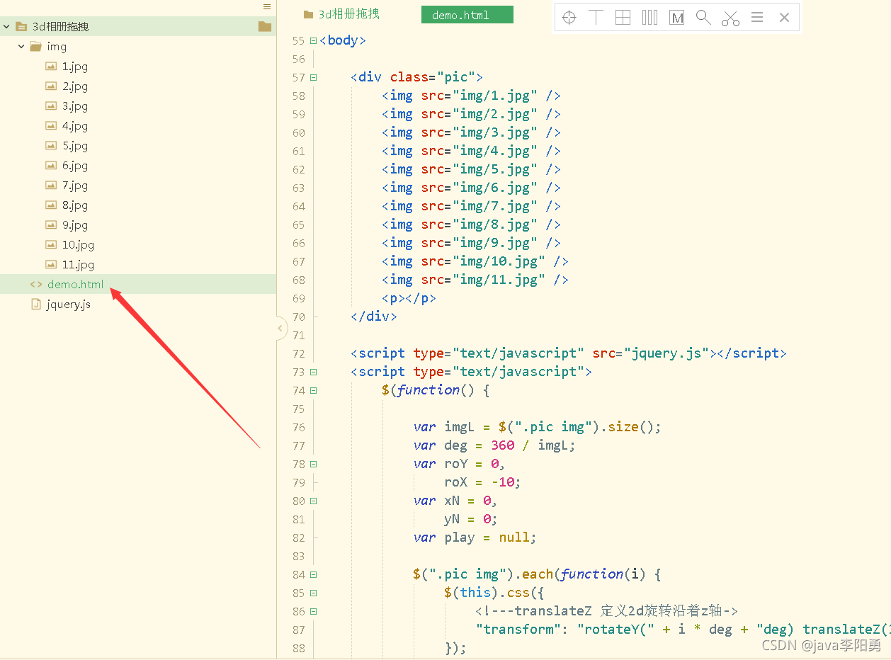 </style><body><div class="pic"><img src="img/1.jpg" /><img src="img/2.jpg" /><img src="img/3.jpg" /><img src="img/4.jpg" /><img src="img/5.jpg" /><img src="img/6.jpg" /><img src="img/7.jpg" /><img src="img/8.jpg" /><img src="img/9.jpg" /><img src="img/10.jpg" /><img src="img/11.jpg" /><p></p></div><script type="text/javascript" src="jquery.js"></script><script type="text/javascript">$(function() {var imgL = $(".pic img").size();var deg = 360 / imgL;var roY = 0,roX = -10;var xN = 0,yN = 0;var play = null;$(".pic img").each(function(i) {$(this).css({<!---translateZ 定义2d旋转沿着z轴->"transform": "rotateY(" + i * deg + "deg) translateZ(300px)"});<!--防止图片被拖拽-->$(this).attr('ondragstart', 'return false');});$(document).mousedown(function(ev) {var x_ = ev.clientX;var y_ = ev.clientY;clearInterval(play);console.log('我按下了');$(this).bind('mousemove', function(ev) {/*获取当前鼠标的坐标*/var x = ev.clientX;var y = ev.clientY;/*两次坐标之间的距离*/xN = x - x_;yN = y - y_;roY += xN * 0.2;roX -= yN * 0.1;console.log('移动');//$('body').append('<div style="width:5px;height:5px;position:absolute;top:'+y+'px;left:'+x+'px;background-color:red"></div>');$('.pic').css({transform: 'perspective(800px) rotateX(' + roX + 'deg) rotateY(' + roY + 'deg)'});/*之前的鼠标坐标*/x_ = ev.clientX;y_ = ev.clientY;});}).mouseup(function() {$(this).unbind('mousemove');var play = setInterval(function() {xN *= 0.95;yN *= 0.95if (Math.abs(xN) < 1 && Math.abs(yN) < 1) {clearInterval(play);}roY += xN * 0.2;roX -= yN * 0.1;$('.pic').css({transform: 'perspective(800px) rotateX(' + roX + 'deg) rotateY(' + roY + 'deg)'});}, 30);});});</script></body></html>