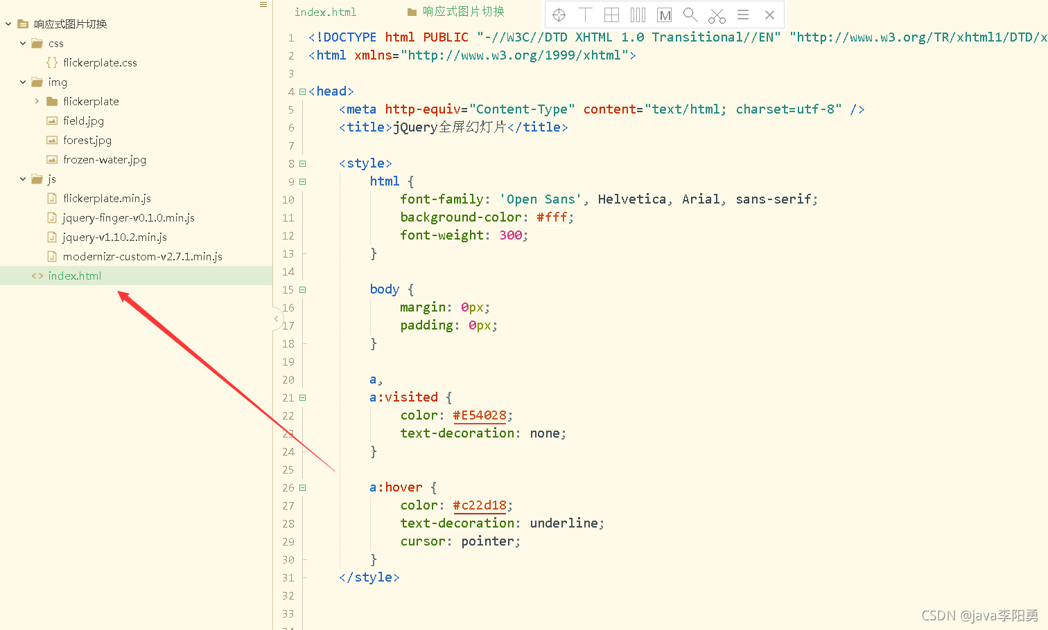 <html xmlns="http://www.w3.org/1999/xhtml"><head><meta http-equiv="Content-Type" content="text/html; charset=utf-8" /><title>jQuery全屏幻灯片</title><style>html {font-family: 'Open Sans', Helvetica, Arial, sans-serif;background-color: #fff;font-weight: 300;}body {margin: 0px;padding: 0px;}a,a:visited {color: #E54028;text-decoration: none;}a:hover {color: #c22d18;text-decoration: underline;cursor: pointer;}</style><!--Required libraries--><script src="js/jquery-v1.10.2.min.js" type="text/javascript"></script><script src="js/modernizr-custom-v2.7.1.min.js" type="text/javascript"></script><script src="js/jquery-finger-v0.1.0.min.js" type="text/javascript"></script><!--Include flickerplate--><link href="css/flickerplate.css" type="text/css" rel="stylesheet"><script src="js/flickerplate.min.js" type="text/javascript"></script><!--Execute flickerplate--><script>$(document).ready(function() {$('.flicker-example').flicker();});</script>