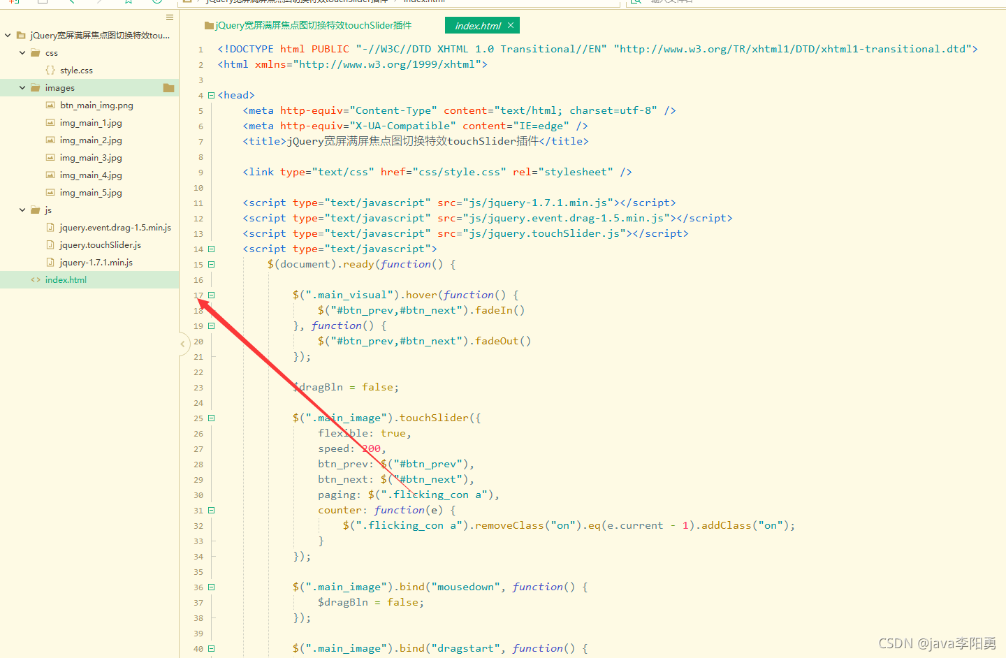 <html xmlns="http://www.w3.org/1999/xhtml"><head><meta http-equiv="Content-Type" content="text/html; charset=utf-8" /><meta http-equiv="X-UA-Compatible" content="IE=edge" /><title>jQuery宽屏满屏焦点图切换特效touchSlider插件</title><link type="text/css" href="css/style.css" rel="stylesheet" /><script type="text/javascript" src="js/jquery-1.7.1.min.js"></script><script type="text/javascript" src="js/jquery.event.drag-1.5.min.js"></script><script type="text/javascript" src="js/jquery.touchSlider.js"></script><script type="text/javascript">$(document).ready(function() {$(".main_visual").hover(function() {$("#btn_prev,#btn_next").fadeIn()}, function() {$("#btn_prev,#btn_next").fadeOut()});$dragBln = false;$(".main_image").touchSlider({flexible: true,speed: 200,btn_prev: $("#btn_prev"),btn_next: $("#btn_next"),paging: $(".flicking_con a"),counter: function(e) {$(".flicking_con a").removeClass("on").eq(e.current - 1).addClass("on");}});$(".main_image").bind("mousedown", function() {$dragBln = false;});$(".main_image").bind("dragstart", function() {$dragBln = true;});$(".main_image a").click(function() {if ($dragBln) {return false;}});timer = setInterval(function() {$("#btn_next").click();}, 5000);$(".main_visual").hover(function() {clearInterval(timer);}, function() {timer = setInterval(function() {$("#btn_next").click();}, 5000);});$(".main_image").bind("touchstart", function() {clearInterval(timer);}).bind("touchend", function() {timer = setInterval(function() {$("#btn_next").click();}, 5000);});});</script>