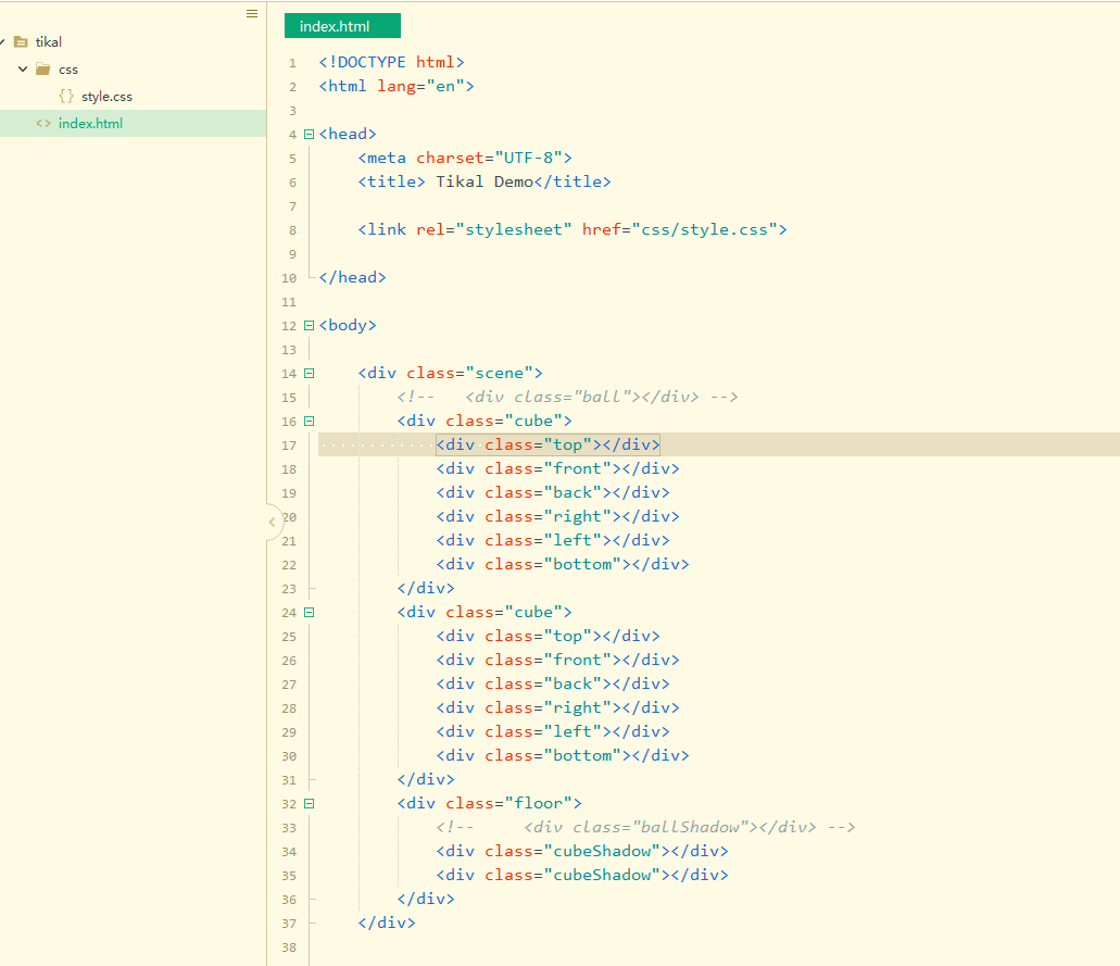<html lang="en"><head><meta charset="UTF-8"><title> Tikal Demo</title><link rel="stylesheet" href="css/style.css"></head><body><div class="scene"><!-- <div class="ball"></div> --><div class="cube"><div class="top"></div><div class="front"></div><div class="back"></div><div class="right"></div><div class="left"></div><div class="bottom"></div></div><div class="cube"><div class="top"></div><div class="front"></div><div class="back"></div><div class="right"></div><div class="left"></div><div class="bottom"></div></div><div class="floor"><!-- <div class="ballShadow"></div> --><div class="cubeShadow"></div><div class="cubeShadow"></div></div></div></body></html>