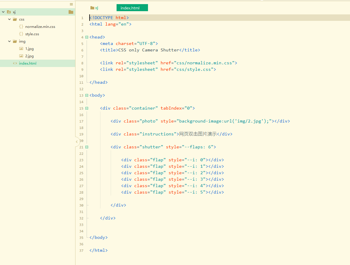 <html lang="en"><head><meta charset="UTF-8"><title>CSS only Camera Shutter</title><link rel="stylesheet" href="css/normalize.min.css"><link rel="stylesheet" href="css/style.css"></head><body><div class="container" tabIndex="0"><div class="photo" style="background-image:url('img/2.jpg');"></div><div class="instructions">网页双击图片演示</div><div class="shutter" style="--flaps: 6"><div class="flap" style="--i: 0"></div><div class="flap" style="--i: 1"></div><div class="flap" style="--i: 2"></div><div class="flap" style="--i: 3"></div><div class="flap" style="--i: 4"></div><div class="flap" style="--i: 5"></div></div></div></body></html>