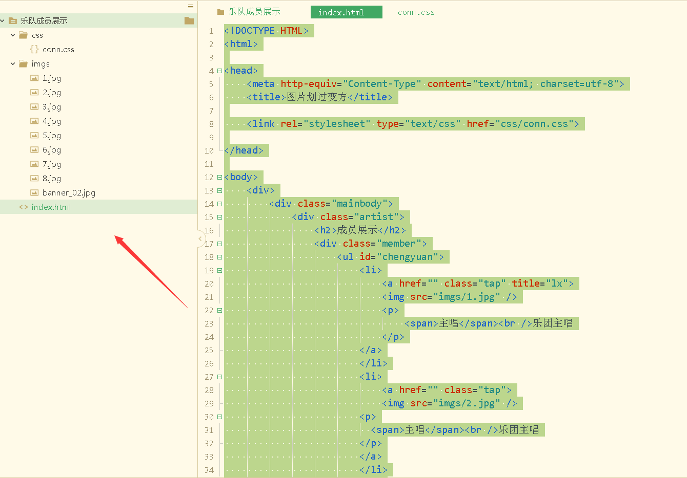 <!DOCTYPE HTML> <html><head><meta http-equiv="Content-Type" content="text/html; charset=utf-8"><title>图片划过变方</title><link rel="stylesheet" type="text/css" href="css/conn.css"></head><body><div><div class="mainbody"><div class="artist"><h2>成员展示</h2><div class="member"><ul id="chengyuan"><li><a href="" class="tap" title="lx"><img src="imgs/1.jpg" /><p><span>主唱</span><br />乐团主唱</p></a></li><li><a href="" class="tap"><img src="imgs/2.jpg" /><p><span>主唱</span><br />乐团主唱</p></a></li><li><a href="" class="tap"><img src="imgs/3.jpg" /><p><span>主唱</span><br />乐团主唱</p></a></li><li><a href="#" class="tap"><img src="imgs/4.jpg" /><p><span>贝斯</span><br />乐团贝斯</p></a></li><li><a href="#" class="tap"><img src="imgs/5.jpg" /><p><span>贝斯</span><br />乐团笛子、萧</p></a></li><li><a href="#" class="tap"><img src="imgs/6.jpg" /><p><span>贝斯</span><br />乐团键盘</p></a></li><li><a href="#" class="tap"><img src="imgs/7.jpg" /><p><span>贝斯</span><br />特邀嘉宾</p></a></li><li><a href="#" class="tap"><img src="imgs/8.jpg" /><p><span>更多神秘嘉宾</span></p></a></li></ul></div></div></div></div> </body></html>