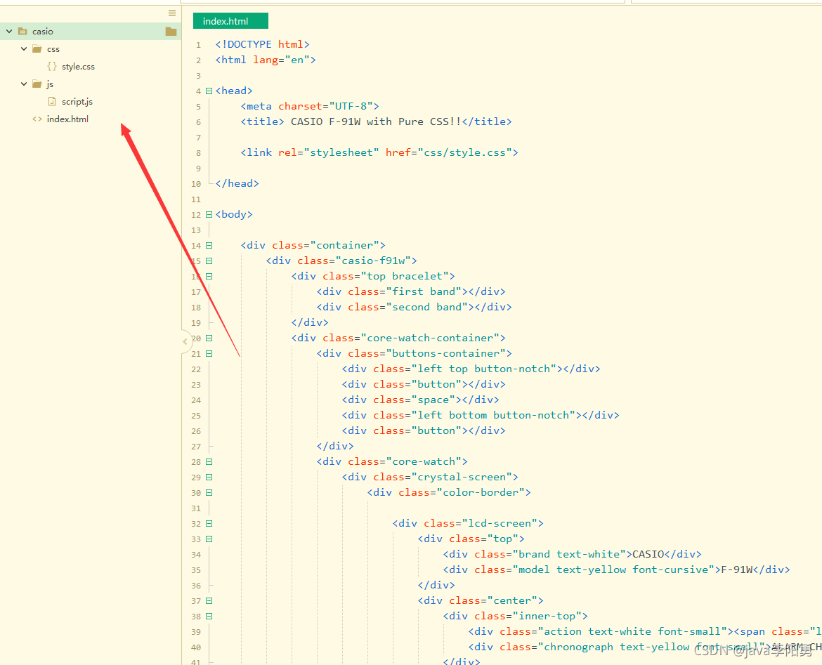 <html lang="en"><head><meta charset="UTF-8"><title> CASIO F-91W with Pure CSS!!</title><link rel="stylesheet" href="css/style.css"></head><body><div class="container"><div class="casio-f91w"><div class="top bracelet"><div class="first band"></div><div class="second band"></div></div><div class="core-watch-container"><div class="buttons-container"><div class="left top button-notch"></div><div class="button"></div><div class="space"></div><div class="left bottom button-notch"></div><div class="button"></div></div><div class="core-watch"><div class="crystal-screen"><div class="color-border"><div class="lcd-screen"><div class="top"><div class="brand text-white">CASIO</div><div class="model text-yellow font-cursive">F-91W</div></div><div class="center"><div class="inner-top"><div class="action text-white font-small"><span class="left arrow">◀</span> LIGHT</div><div class="chronograph text-yellow font-small">ALARM CHRONOGRAPH</div></div><div class="inner-center"><div class="lcd-top"><span class="timemode">24H</span><span class="weekday mini">--</span><span class="day mini">--</span></div><div class="lcd-bottom"><span class="time"><span class="hours">--</span><span class="sep">:</span><span class="minutes">--</span></span><span class="seconds mini">--</span></div></div><div class="inner-bottom"><div class="mode text-white font-small"><span class="left arrow">◀</span> MODE</div><div class="alarm text-white font-small">ALARM ON-OFF/24HR <span class="right arrow">▶</span></div></div></div><div class="bottom"><div class="water text-white font-medium">WATER</div><div class="wr-box text-red"><span>W<span class="r">R</span></span></div><div class="resist text-white font-medium">RESIST</div></div></div></div></div></div><div class="buttons-container"><div class="right top button-notch"></div><div class="space"></div><div class="right bottom button-notch"></div><div class="button"></div></div></div><div class="bottom bracelet"><div class="first band"></div><div class="second band"></div></div></div></div><script src="js/script.js"></script></body></html>js文件在上面截图可以看到 需要引进来。