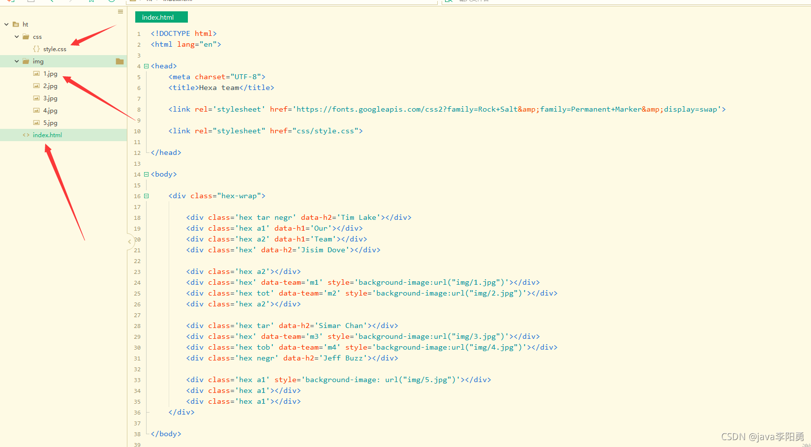<html lang="en"><head><meta charset="UTF-8"><title>Hexa team</title><link rel='stylesheet' href='https://fonts.googleapis.com/css2?family=Rock+Salt&family=Permanent+Marker&display=swap'><link rel="stylesheet" href="css/style.css"></head><body><div class="hex-wrap"><div class='hex tar negr' data-h2='Tim Lake'></div><div class='hex a1' data-h1='Our'></div><div class='hex a2' data-h1='Team'></div><div class='hex' data-h2='Jisim Dove'></div><div class='hex a2'></div><div class='hex' data-team='m1' style='background-image:url("img/1.jpg")'></div><div class='hex tot' data-team='m2' style='background-image:url("img/2.jpg")'></div><div class='hex a2'></div><div class='hex tar' data-h2='Simar Chan'></div><div class='hex' data-team='m3' style='background-image:url("img/3.jpg")'></div><div class='hex tob' data-team='m4' style='background-image:url("img/4.jpg")'></div><div class='hex negr' data-h2='Jeff Buzz'></div><div class='hex a1' style='background-image: url("img/5.jpg")'></div><div class='hex a1'></div><div class='hex a1'></div></div></body></html>js文件在上面截图可以看到 需要引进来。