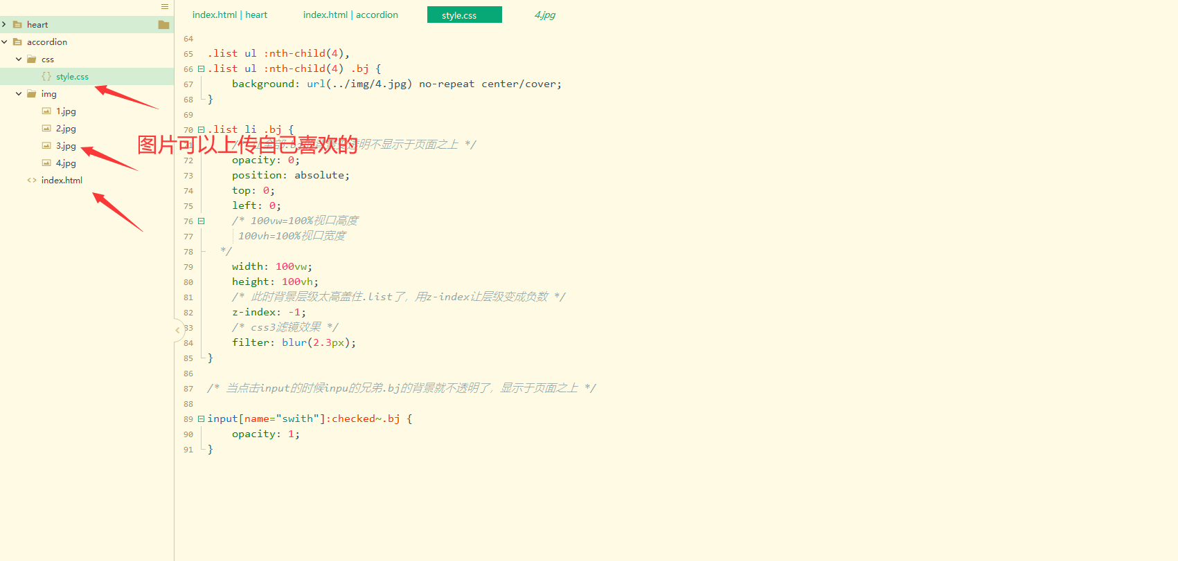 }.list li .bj {/* 让全部.bj的背景变透明不显示于页面之上 */opacity: 0;position: absolute;top: 0;left: 0;/* 100vw=100%视口高度100vh=100%视口宽度*/width: 100vw;height: 100vh;/* 此时背景层级太高盖住.list了,用z-index让层级变成负数 */z-index: -1;/* css3滤镜效果 */filter: blur(2.3px);