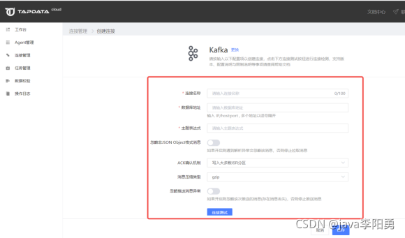 3. 同第一步操作,点击左侧菜单栏的【连接管理】,然后点击右侧区域【连接列表】右上角的【创建连接】按钮,打开连接类型选择页面,然后选择 Kafka