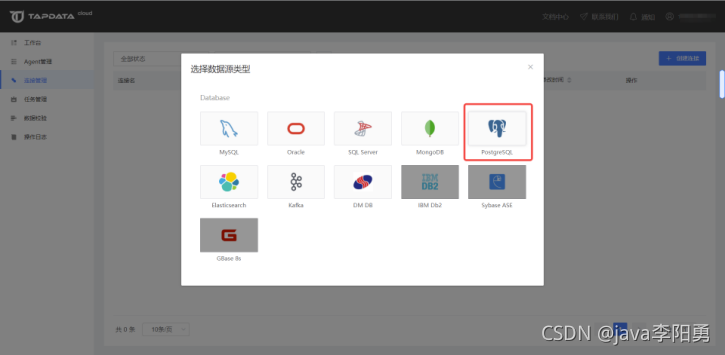 3. 同第一步操作,点击左侧菜单栏的【连接管理】,然后点击右侧区域【连接列表】右上角的【创建连接】按钮,打开连接类型选择页面,然后选择 PostgreSQL