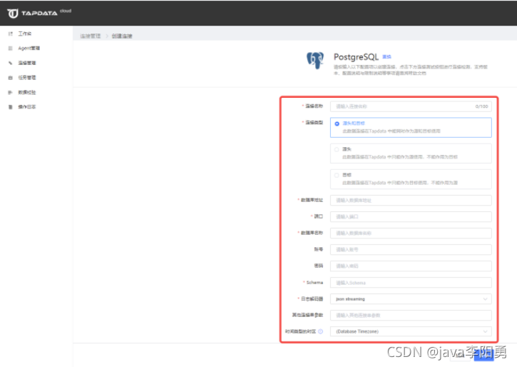 【数据库名称】:tapdata 数据库连接是以一个 db 为一个数据源。这里的 db 是指一个数据库实例中的 database,而不是一个 schema。