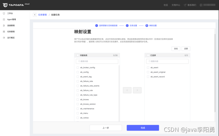根据数据需求,选择需要同步的库、表,如果你对表名有修改需要,可以通过页面中的表名批量修改功能对目标端的表名进行批量设置.