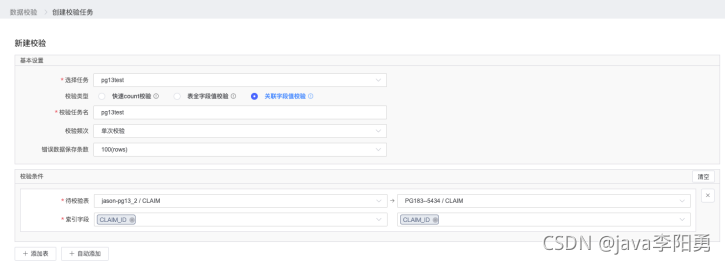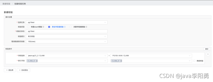 如果觉得不够用,也可以选择表全字段值校验 ,这个除了要选择待校验表外,还需要针对每一个表设置索引字段。
