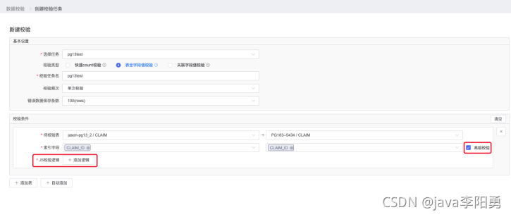 在进行表全字段值校验时,还支持进行高级校验。通过高级校验可以添加JS校验逻辑,可以对源和目标的数据进行校验。