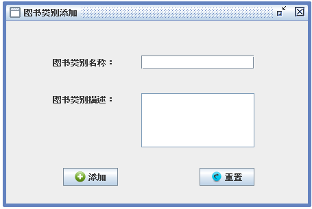 import javax.swing.ImageIcon;public class BookAddInterFrm extends JInternalFrame {private JTextField bookNameTxt;private JTextField authorTxt;private final ButtonGroup buttonGroup = new ButtonGroup();private JTextField priceTxt;private DbUtil dbUtil = new DbUtil();private BookTypeDao bookTypeDao = new BookTypeDao();private BookDao bookDao = new BookDao();private	JComboBox bookTypeJcb;private JTextArea bookDescTxt;private JRadioButton manJrb; private JRadioButton femaleJrb;/*** Launch the application.*/public static void main(String[] args) {EventQueue.invokeLater(new Runnable() {public void run() {try {BookAddInterFrm frame = new BookAddInterFrm();frame.setVisible(true);} catch (Exception e) {e.printStackTrace();}}});}/*** Create the frame.*/public BookAddInterFrm() {setIconifiable(true);setClosable(true);setTitle("图书添加");setBounds(100, 100, 450, 463);JLabel lblNewLabel = new JLabel("图书名字:");bookNameTxt = new JTextField();bookNameTxt.setColumns(10);JLabel lblNewLabel_1 = new JLabel("图书作者:");authorTxt = new JTextField();authorTxt.setColumns(10);JLabel lblNewLabel_2 = new JLabel("作者性别:");manJrb = new JRadioButton("男");buttonGroup.add(manJrb);manJrb.setSelected(true);femaleJrb = new JRadioButton("女");buttonGroup.add(femaleJrb);JLabel lblNewLabel_3 = new JLabel("图书价格:");priceTxt = new JTextField();priceTxt.setColumns(10);JLabel lblNewLabel_4 = new JLabel("图书描述:");bookDescTxt = new JTextArea();JLabel lblNewLabel_5 = new JLabel("图书类别:");bookTypeJcb = new JComboBox();JButton btnNewButton = new JButton("添加");btnNewButton.setIcon(new ImageIcon(BookAddInterFrm.class.getResource("/images/add.png")));btnNewButton.addActionListener(new ActionListener() {public void actionPerformed(ActionEvent e) {bookAddActionPerformed(e);}});JButton btnNewButton_1 = new JButton("重置");btnNewButton_1.setIcon(new ImageIcon(BookAddInterFrm.class.getResource("/images/add.png")));btnNewButton_1.addActionListener(new ActionListener() {public void actionPerformed(ActionEvent e) {bookValueActionPerformed(e);}});btnNewButton_1.setIcon(new ImageIcon(BookAddInterFrm.class.getResource("/images/reset.png")));GroupLayout groupLayout = new GroupLayout(getContentPane());groupLayout.setHorizontalGroup(groupLayout.createParallelGroup(Alignment.LEADING).addGroup(groupLayout.createSequentialGroup().addGap(28).addGroup(groupLayout.createParallelGroup(Alignment.LEADING).addGroup(groupLayout.createSequentialGroup().addComponent(lblNewLabel_4).addPreferredGap(ComponentPlacement.RELATED).addComponent(bookDescTxt, GroupLayout.DEFAULT_SIZE, 262, Short.MAX_VALUE)).addGroup(groupLayout.createSequentialGroup().addGroup(groupLayout.createParallelGroup(Alignment.LEADING, false).addGroup(groupLayout.createSequentialGroup().addComponent(lblNewLabel_2).addPreferredGap(ComponentPlacement.UNRELATED).addComponent(manJrb).addPreferredGap(ComponentPlacement.RELATED, GroupLayout.DEFAULT_SIZE, Short.MAX_VALUE).addComponent(femaleJrb)).addGroup(groupLayout.createSequentialGroup().addComponent(lblNewLabel).addPreferredGap(ComponentPlacement.RELATED).addComponent(bookNameTxt, GroupLayout.PREFERRED_SIZE, 91, GroupLayout.PREFERRED_SIZE))).addGap(18).addGroup(groupLayout.createParallelGroup(Alignment.LEADING).addComponent(lblNewLabel_3).addComponent(lblNewLabel_1)).addPreferredGap(ComponentPlacement.RELATED).addGroup(groupLayout.createParallelGroup(Alignment.LEADING).addComponent(authorTxt, GroupLayout.DEFAULT_SIZE, 89, Short.MAX_VALUE).addComponent(priceTxt, GroupLayout.DEFAULT_SIZE, 89, Short.MAX_VALUE))).addGroup(groupLayout.createSequentialGroup().addComponent(btnNewButton).addGap(33).addComponent(btnNewButton_1)).addGroup(groupLayout.createSequentialGroup().addComponent(lblNewLabel_5).addPreferredGap(ComponentPlacement.RELATED).addComponent(bookTypeJcb, 0, 262, Short.MAX_VALUE))).addGap(80)));groupLayout.setVerticalGroup(groupLayout.createParallelGroup(Alignment.LEADING).addGroup(groupLayout.createSequentialGroup().addGap(33).addGroup(groupLayout.createParallelGroup(Alignment.BASELINE).addComponent(lblNewLabel).addComponent(bookNameTxt, GroupLayout.PREFERRED_SIZE, GroupLayout.DEFAULT_SIZE, GroupLayout.PREFERRED_SIZE).addComponent(authorTxt, GroupLayout.PREFERRED_SIZE, GroupLayout.DEFAULT_SIZE, GroupLayout.PREFERRED_SIZE).addComponent(lblNewLabel_1)).addGap(26).addGroup(groupLayout.createParallelGroup(Alignment.BASELINE).addComponent(lblNewLabel_2).addComponent(manJrb).addComponent(femaleJrb).addComponent(lblNewLabel_3).addComponent(priceTxt, GroupLayout.PREFERRED_SIZE, GroupLayout.DEFAULT_SIZE, GroupLayout.PREFERRED_SIZE)).addGap(26).addGroup(groupLayout.createParallelGroup(Alignment.BASELINE).addComponent(lblNewLabel_5).addComponent(bookTypeJcb, GroupLayout.PREFERRED_SIZE, GroupLayout.DEFAULT_SIZE, GroupLayout.PREFERRED_SIZE)).addGap(30).addGroup(groupLayout.createParallelGroup(Alignment.LEADING).addComponent(lblNewLabel_4).addComponent(bookDescTxt, GroupLayout.PREFERRED_SIZE, 140, GroupLayout.PREFERRED_SIZE)).addPreferredGap(ComponentPlacement.RELATED, 38, Short.MAX_VALUE).addGroup(groupLayout.createParallelGroup(Alignment.BASELINE).addComponent(btnNewButton).addComponent(btnNewButton_1)).addGap(50)));getContentPane().setLayout(groupLayout);//显示文本域边框bookDescTxt.setBorder(new LineBorder(new java.awt.Color(127,157,185),1,false));fillBookType();}/*** 重置事件处理* @param e*/private void bookValueActionPerformed(ActionEvent e) {// TODO Auto-generated method stubthis.resetValue();}private void bookAddActionPerformed(ActionEvent evt) {// TODO Auto-generated method stubString bookName = this.bookNameTxt.getText();String author = this.authorTxt.getText();String price = this.priceTxt.getText();String bookDesc = this.bookDescTxt.getText();if(StringUtil.isEmpty(bookName)){JOptionPane.showMessageDialog(null,"图书名称不能为空");}if(StringUtil.isEmpty(author)){JOptionPane.showMessageDialog(null,"图书作者不能为空");}if(StringUtil.isEmpty(price)){JOptionPane.showMessageD