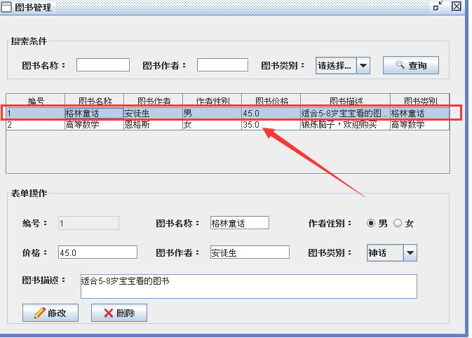 图书信息维护管理、点击图书维护可以根据图书名称、作者以及图书类型模糊查询图书信息、可以点击下面的输入框进行数据修改和删除操作