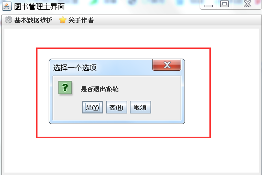 import java.awt.event.ActionEvent;public class MainFrm extends JFrame {private JPanel contentPane;private JDesktopPane table = null;/*** Launch the application.*/public static void main(String[] args) {EventQueue.invokeLater(new Runnable() {public void run() {try {MainFrm frame = new MainFrm();frame.setVisible(true);} catch (Exception e) {e.printStackTrace();}}});}/*** Create the frame.*/public MainFrm() {setTitle("图书管理主界面");setDefaultCloseOperation(JFrame.EXIT_ON_CLOSE);setBounds(100, 100, 450, 300);JMenuBar menuBar = new JMenuBar();setJMenuBar(menuBar);JMenu menu = new JMenu("基本数据维护");menu.setIcon(new ImageIcon(MainFrm.class.getResource("/images/base.png")));menuBar.add(menu);JMenu mnNewMenu = new JMenu("图书类别管理");mnNewMenu.setIcon(new ImageIcon(MainFrm.class.getResource("/images/bookTypeManager.png")));menu.add(mnNewMenu);JMenuItem menuItem = new JMenuItem("图书类别添加");menuItem.addActionListener(new ActionListener() {public void actionPerformed(ActionEvent e) {BookTypeAddInterFrm bookTypeAddInterFrm = new BookTypeAddInterFrm();bookTypeAddInterFrm.setVisible(true);table.add(bookTypeAddInterFrm);}});menuItem.setIcon(new ImageIcon(MainFrm.class.getResource("/images/add.png")));mnNewMenu.add(menuItem);JMenuItem menuItem_2 = new JMenuItem("图书类别维护");menuItem_2.addActionListener(new ActionListener() {public void actionPerformed(ActionEvent e) {BookTypeManagerInterFrm bookTypeManagerInterFrm = new BookTypeManagerInterFrm();bookTypeManagerInterFrm.setVisible(true);table.add(bookTypeManagerInterFrm);}});menuItem_2.setIcon(new ImageIcon(MainFrm.class.getResource("/images/edit.png")));mnNewMenu.add(menuItem_2);JMenu mnNewMenu_1 = new JMenu("图书管理");mnNewMenu_1.setIcon(new ImageIcon(MainFrm.class.getResource("/images/bookManager.png")));menu.add(mnNewMenu_1);JMenuItem menuItem_1 = new JMenuItem("图书添加");menuItem_1.addActionListener(new ActionListener() {public void actionPerformed(ActionEvent e) {BookAddInterFrm bookAddInterFrm = new BookAddInterFrm();bookAddInterFrm.setVisible(true);table.add(bookAddInterFrm);}});menuItem_1.setIcon(new ImageIcon(MainFrm.class.getResource("/images/add.png")));mnNewMenu_1.add(menuItem_1);JMenuItem mntmNewMenuItem = new JMenuItem("图书维护");mntmNewMenuItem.addActionListener(new ActionListener() {public void actionPerformed(ActionEvent e) {BookManageInterFrm bookManagerInterFrm = new BookManageInterFrm();bookManagerInterFrm.setVisible(true);table.add(bookManagerInterFrm);}});mntmNewMenuItem.setIcon(new ImageIcon(MainFrm.class.getResource("/images/edit.png")));mnNewMenu_1.add(mntmNewMenuItem);JMenuItem menuItem_3 = new JMenuItem("安全退出");menuItem_3.addActionListener(new ActionListener() {public void actionPerformed(ActionEvent e) {int result =JOptionPane.showConfirmDialog(null,"是否退出系统");}});menuItem_3.setIcon(new ImageIcon(MainFrm.class.getResource("/images/exit.png")));menu.add(menuItem_3);JMenu menu_1 = new JMenu("关于作者");menu_1.setIcon(new ImageIcon(MainFrm.class.getResource("/images/about.png")));menuBar.add(menu_1);JMenuItem mntmhpioneer = new JMenuItem("关于奥斯卡");mntmhpioneer.addActionListener(new ActionListener() {public void actionPerformed(ActionEvent e) {HPioneer1234InterFrm hPioneer1234InterFrm = new HPioneer1234InterFrm();hPioneer1234InterFrm.setVisible(true);table.add(hPioneer1234InterFrm);}});mntmhpioneer.setIcon(new ImageIcon(MainFrm.class.getResource("/images/userName.png")));menu_1.add(mntmhpioneer);contentPane = new JPanel();contentPane.setForeground(Color.BLUE);contentPane.setBorder(new EmptyBorder(5, 5, 5, 5));setContentPane(contentPane);contentPane.setLayout(new BorderLayout(0, 0));table = new JDesktopPane();		table.setBackground(Color.WHITE);contentPane.add(table);//设置Jrame最大化this.setExtendedState(JFrame.MAXIMIZED_BOTH);}
