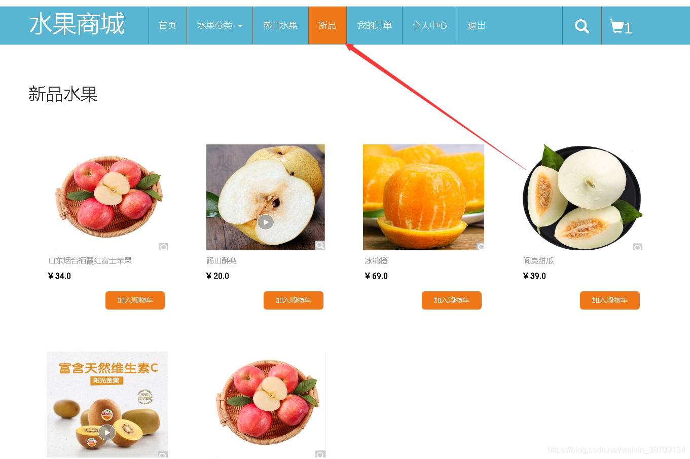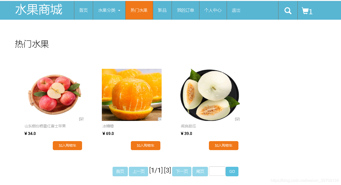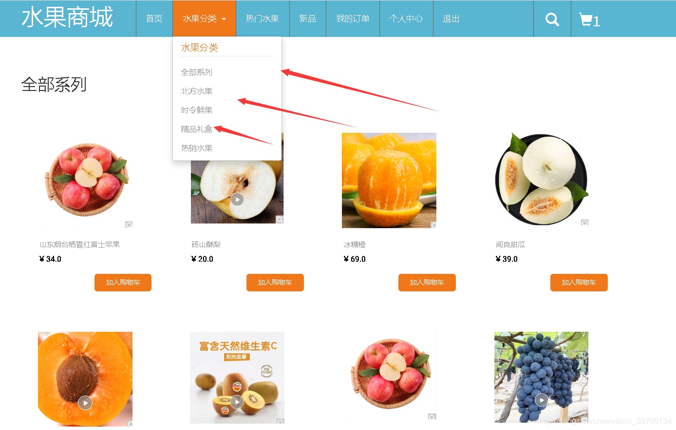 首页主要功能是水果的商品展示、可以查看水果分类、用户可以进行网页登录和注册功能。以及根据关键字搜索水果商品信息