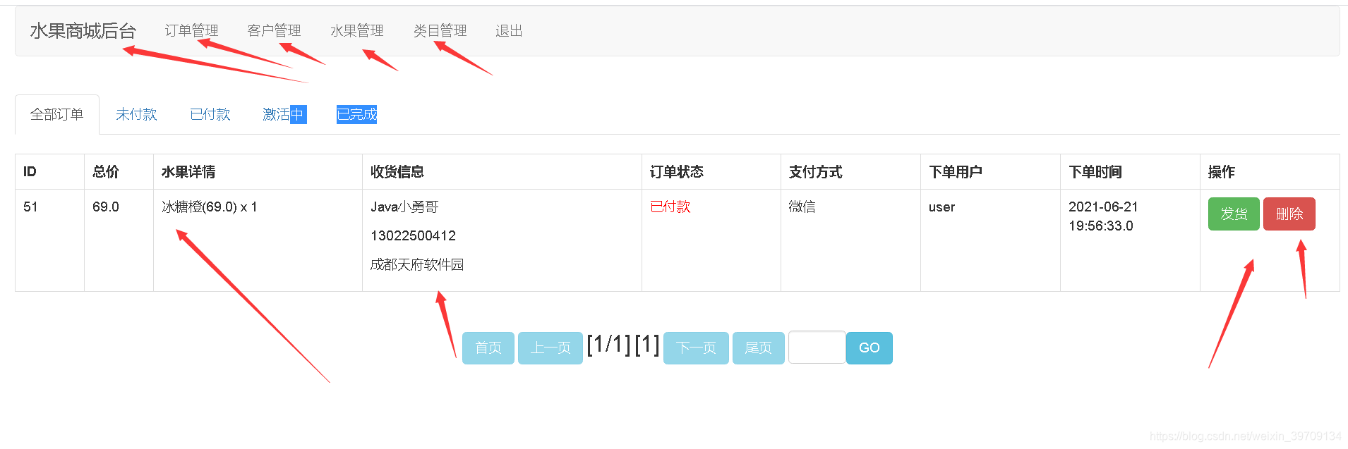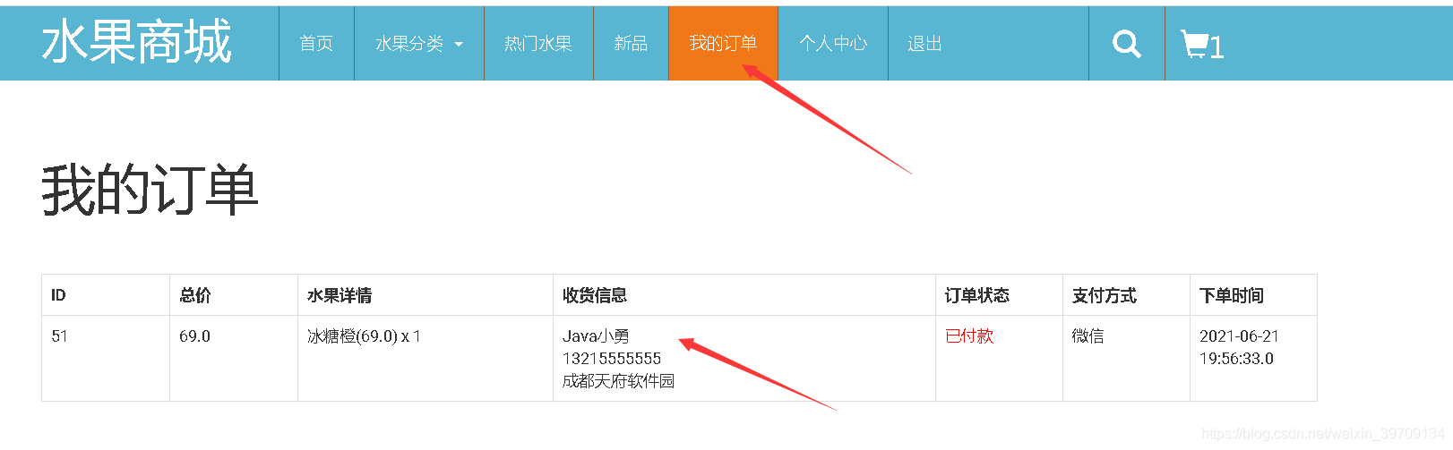 <!--//header--><!--//header--><!--cart-items--><div class="cart-items"><div class="container"><h2>我的订单</h2><table class="table table-bordered table-hover"><tr><th width="10%">ID</th><th width="10%">总价</th><th width="20%">水果详情</th><th width="30%">收货信息</th><th width="10%">订单状态</th><th width="10%">支付方式</th><th width="10%">下单时间</th></tr><tr><td><p>51</p></td><td><p>69.0</p></td><td><p>冰糖橙(69.0) x 1</p></td><td><p>Java小勇哥</p><p>13022500110</p><p>天府软件园</p></td><td><p><span style="color:red;">已付款</span></p></td><td><p>微信</p></td><td><p>2021-06-21 19:56:33.0</p></td></tr></table></div></div><!--//cart-items--> <!--footer--><!--footer-->