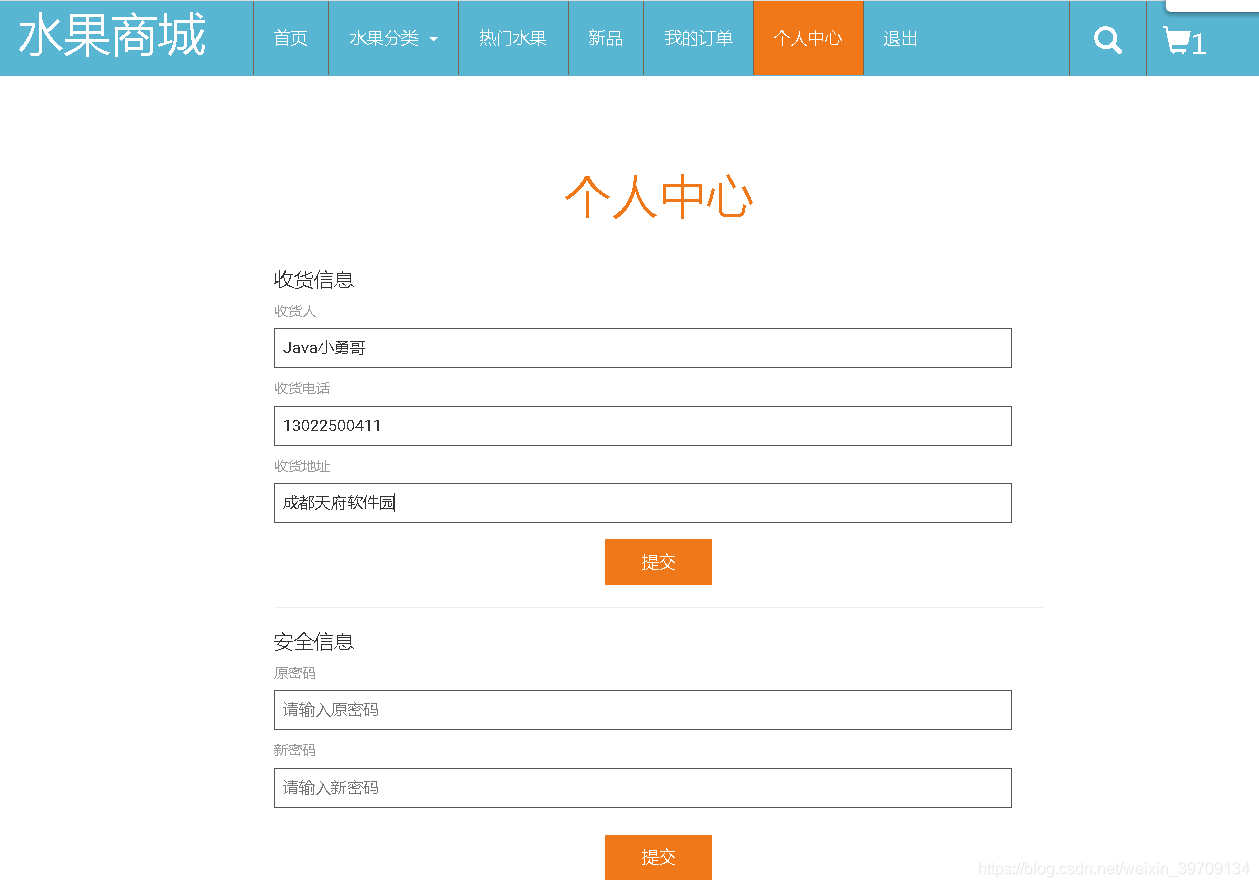 <div class="header"><div class="container"><nav class="navbar navbar-default" role="navigation"><div class="navbar-header"><button type="button" class="navbar-toggle" data-toggle="collapse" data-target="#bs-example-navbar-collapse-1"><span class="sr-only">Toggle navigation</span><span class="icon-bar"></span><span class="icon-bar"></span><span class="icon-bar"></span></button><h1 class="navbar-brand"><a href="/jsp_shuiguosaleshop/index">水果商城</a></h1></div><!--navbar-header--><div class="collapse navbar-collapse" id="bs-example-navbar-collapse-1"><ul class="nav navbar-nav"><li><a href="/jsp_shuiguosaleshop/index" >首页</a></li><li class="dropdown"><a href="#" class="dropdown-toggle " data-toggle="dropdown">水果分类<b class="caret"></b></a><ul class="dropdown-menu multi-column columns-2"><li><div class="row"><div class="col-sm-12"><h4>水果分类</h4><ul class="multi-column-dropdown"><li><a class="list" href="/jsp_shuiguosaleshop/goods_list">全部系列</a></li><li><a class="list" href="/jsp_shuiguosaleshop/goods_list?typeid=18">北方水果</a></li><li><a class="list" href="/jsp_shuiguosaleshop/goods_list?typeid=19">时令鲜果</a></li><li><a class="list" href="/jsp_shuiguosaleshop/goods_list?typeid=20">精品礼盒</a></li><li><a class="list" href="/jsp_shuiguosaleshop/goods_list?typeid=21">热销水果</a></li></ul></div></div></li></ul></li><li><a href="/jsp_shuiguosaleshop/goodsrecommend_list?type=2" >热门水果</a></li><li><a href="/jsp_shuiguosaleshop/goodsrecommend_list?type=3" >新品</a></li><li><a href="/jsp_shuiguosaleshop/order_list" class="active">我的订单</a></li><li><a href="/jsp_shuiguosaleshop/user_center.jsp" >个人中心</a></li><li><a href="/jsp_shuiguosaleshop/user_logout" >退出</a></li></ul><!--/.navbar-collapse--></div><!--//navbar-header--></nav><div class="header-info"><div class="header-right search-box"><a href="javascript:;"><span class="glyphicon glyphicon-search" aria-hidden="true"></span></a><div class="search"><form class="navbar-form" action="/jsp_shuiguosaleshop/goods_search"><input type="text" class="form-control" name="keyword"><button type="submit" class="btn btn-default " aria-label="Left Align">搜索</button></form></div></div><div class="header-right cart"><a href="goods_cart.jsp"><span class="glyphicon glyphicon-shopping-cart " aria-hidden="true"><span class="card_num">1</span></span></a></div><div class="clearfix"> </div></div><div class="clearfix"> </div></div>