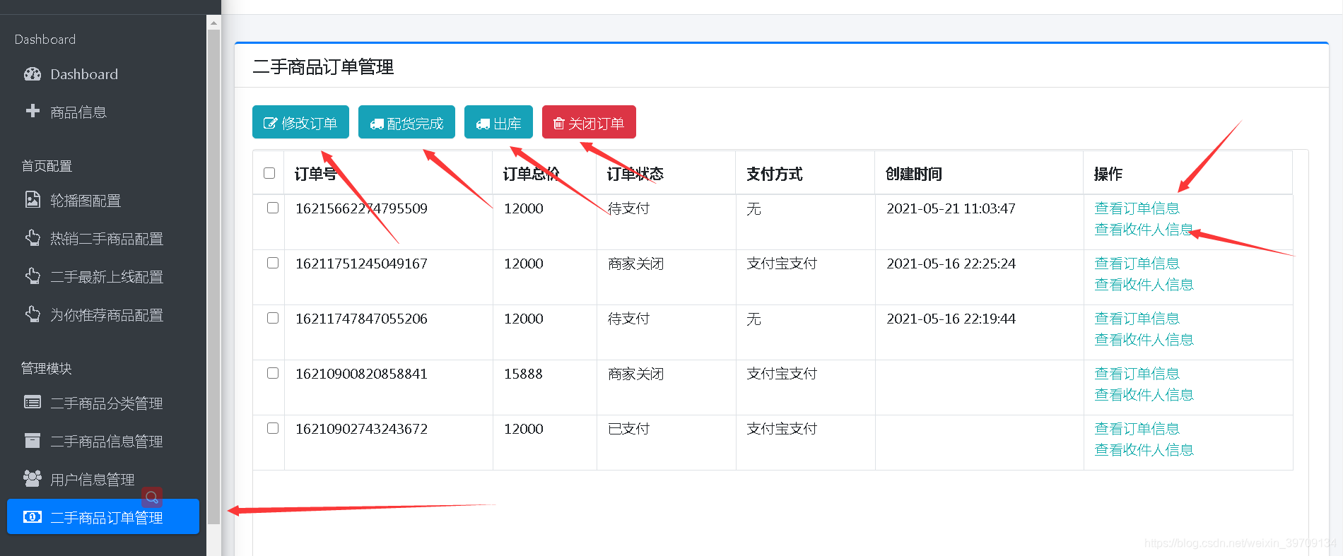 public class NewBeeMallOrderController {@Resourceprivate NewBeeMallOrderService newBeeMallOrderService;@GetMapping("/orders")public String ordersPage(HttpServletRequest request) {request.setAttribute("path", "orders");return "admin/newbee_mall_order";}/*** 列表*/@RequestMapping(value = "/orders/list", method = RequestMethod.GET)@ResponseBodypublic Result list(@RequestParam Map<String, Object> params) {if (StringUtils.isEmpty(params.get("page")) || StringUtils.isEmpty(params.get("limit"))) {return ResultGenerator.genFailResult("参数异常!");}PageQueryUtil pageUtil = new PageQueryUtil(params);return ResultGenerator.genSuccessResult(newBeeMallOrderService.getNewBeeMallOrdersPage(pageUtil));}/*** 修改*/@RequestMapping(value = "/orders/update", method = RequestMethod.POST)@ResponseBodypublic Result update(@RequestBody NewBeeMallOrder newBeeMallOrder) {if (Objects.isNull(newBeeMallOrder.getTotalPrice())|| Objects.isNull(newBeeMallOrder.getOrderId())|| newBeeMallOrder.getOrderId() < 1|| newBeeMallOrder.getTotalPrice() < 1|| StringUtils.isEmpty(newBeeMallOrder.getUserAddress())) {return ResultGenerator.genFailResult("参数异常!");}String result = newBeeMallOrderService.updateOrderInfo(newBeeMallOrder);if (ServiceResultEnum.SUCCESS.getResult().equals(result)) {return ResultGenerator.genSuccessResult();} else {return ResultGenerator.genFailResult(result);}}/*** 详情*/@GetMapping("/order-items/{id}")@ResponseBodypublic Result info(@PathVariable("id") Long id) {List<NewBeeMallOrderItemVO> orderItems = newBeeMallOrderService.getOrderItems(id);if (!CollectionUtils.isEmpty(orderItems)) {return ResultGenerator.genSuccessResult(orderItems);}return ResultGenerator.genFailResult(ServiceResultEnum.DATA_NOT_EXIST.getResult());}/*** 配货*/@RequestMapping(value = "/orders/checkDone", method = RequestMethod.POST)@ResponseBodypublic Result checkDone(@RequestBody Long[] ids) {if (ids.length < 1) {return ResultGenerator.genFailResult("参数异常!");}String result = newBeeMallOrderService.checkDone(ids);if (ServiceResultEnum.SUCCESS.getResult().equals(result)) {return ResultGenerator.genSuccessResult();} else {return ResultGenerator.genFailResult(result);}}/*** 出库*/@RequestMapping(value = "/orders/checkOut", method = RequestMethod.POST)@ResponseBodypublic Result checkOut(@RequestBody Long[] ids) {if (ids.length < 1) {return ResultGenerator.genFailResult("参数异常!");}String result = newBeeMallOrderService.checkOut(ids);if (ServiceResultEnum.SUCCESS.getResult().equals(result)) {return ResultGenerator.genSuccessResult();} else {return ResultGenerator.genFailResult(result);}}/*** 关闭订单*/@RequestMapping(value = "/orders/close", method = RequestMethod.POST)@ResponseBodypublic Result closeOrder(@RequestBody Long[] ids) {if (ids.length < 1) {return ResultGenerator.genFailResult("参数异常!");}String result = newBeeMallOrderService.closeOrder(ids);if (ServiceResultEnum.SUCCESS.getResult().equals(result)) {return ResultGenerator.genSuccessResult();} else {return ResultGenerator.genFailResult(result);}}}