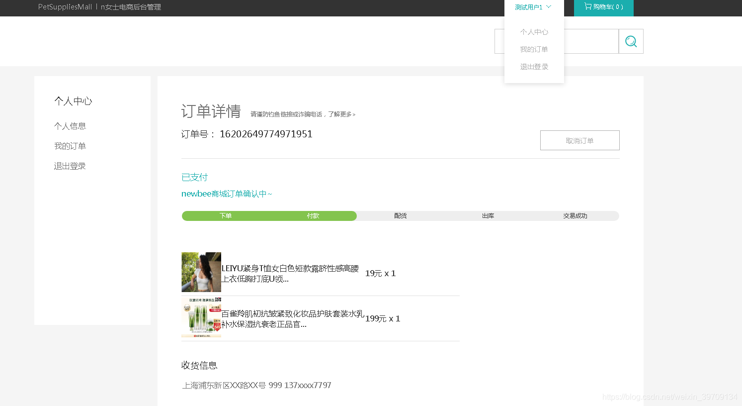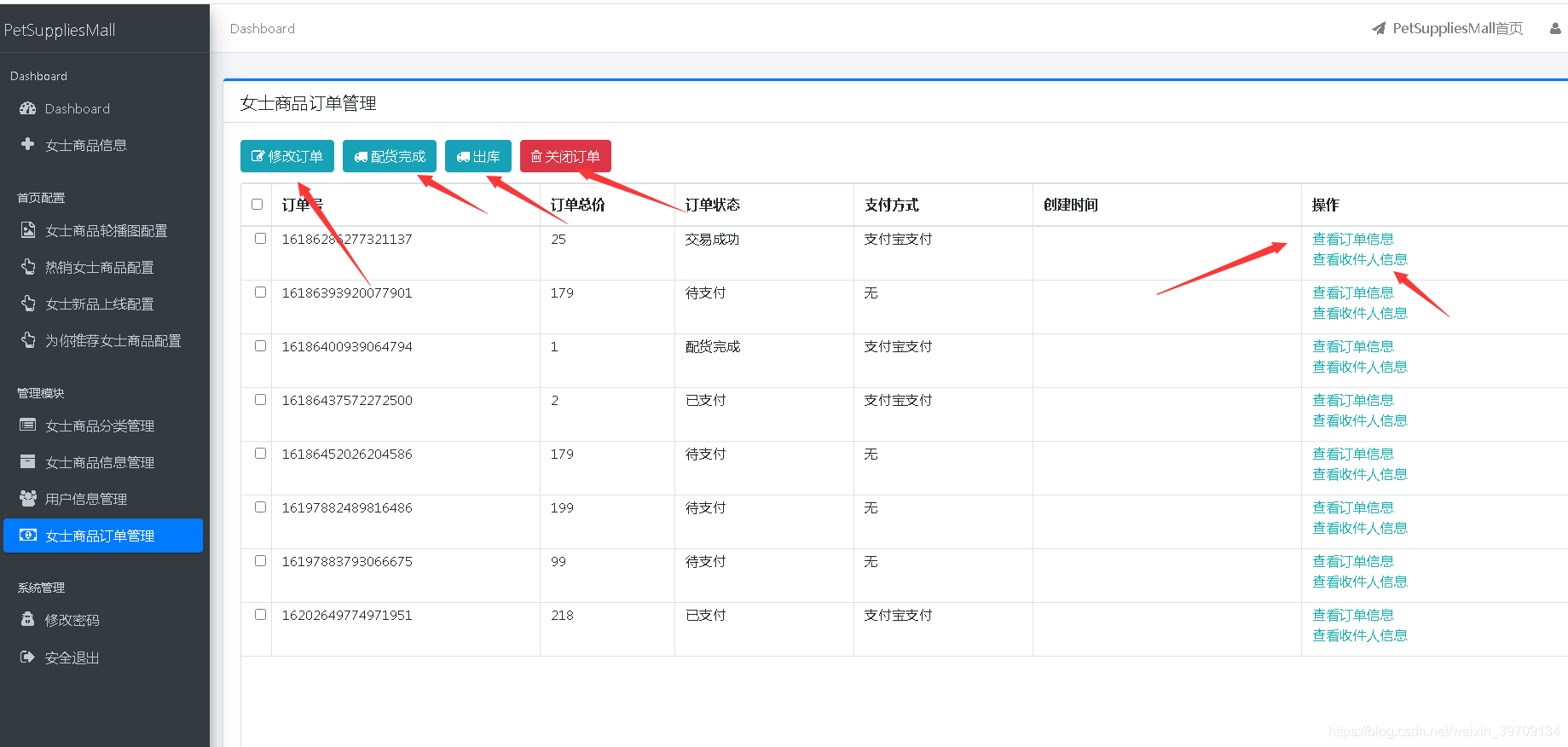 订单信息管理:订单信息流程主要有:用户模拟支付了以后配货、出库、订单完成、以及查看订单信息和查看收件人信息等功能