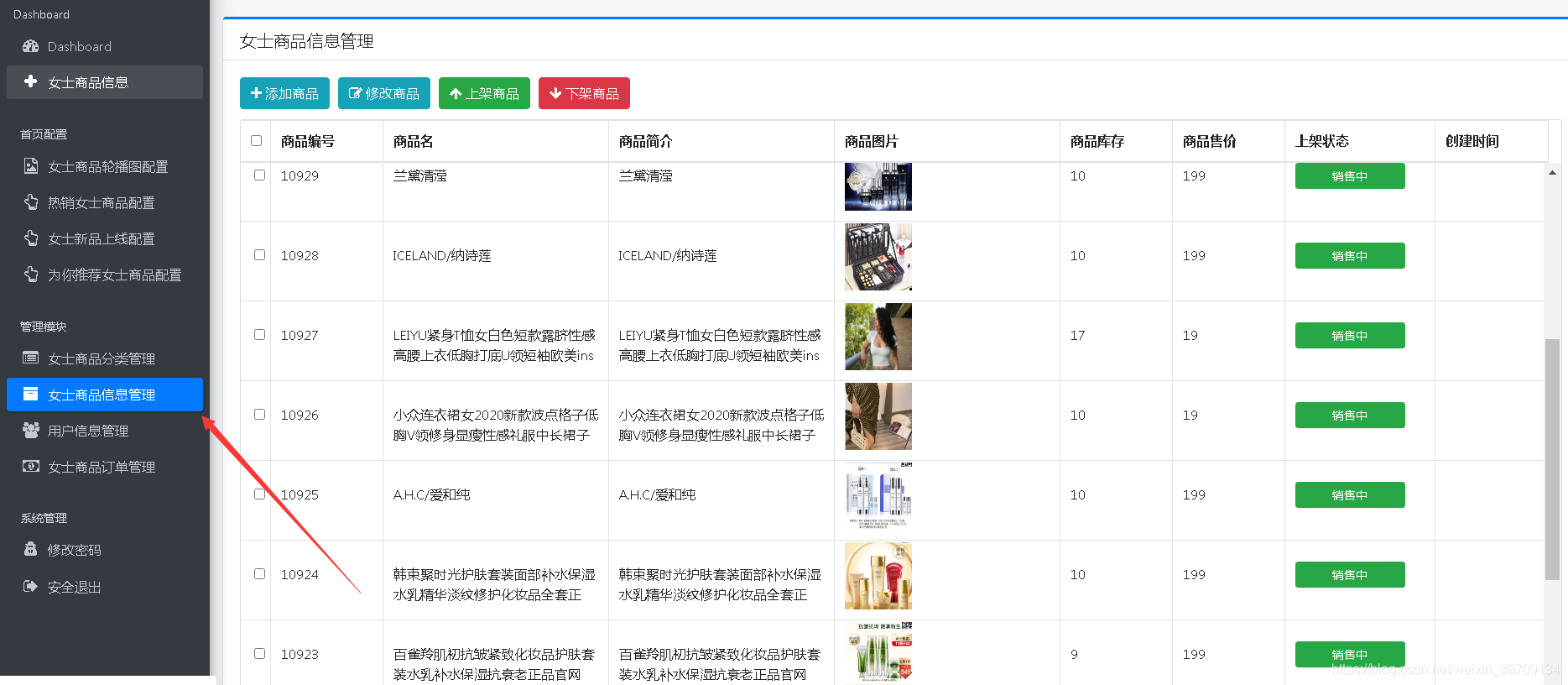 主要功能:用户登录、用户手机号注册、女士商品浏览、分类过来、模糊查找商品、轮播图设计和查看、热销商品管理、购物车管理、订单管理、收货地址管理、订单流程控制、用户管理、修改密码等