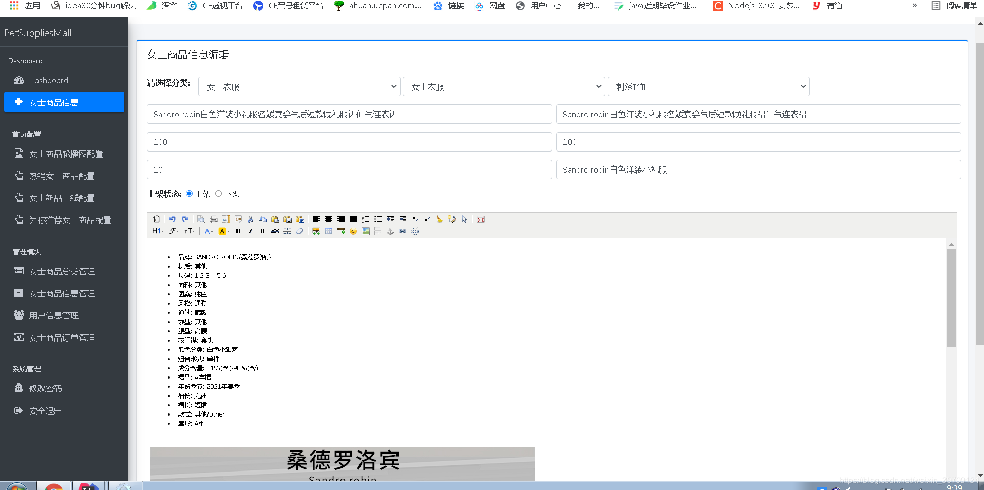 添加女士商品、这个地方用的富文本编译器上传的商品信息、可以直接从淘宝等地方复制数据过来。