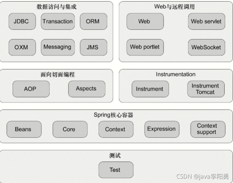 Spring为简化我们的开发工作,封装了一系列的开箱即用的组件功能模块,包括:Spring JDBC 、Spring MVC 、Spring Security、 Spring AOP 、Spring ORM 、Spring Test等。如下图:
