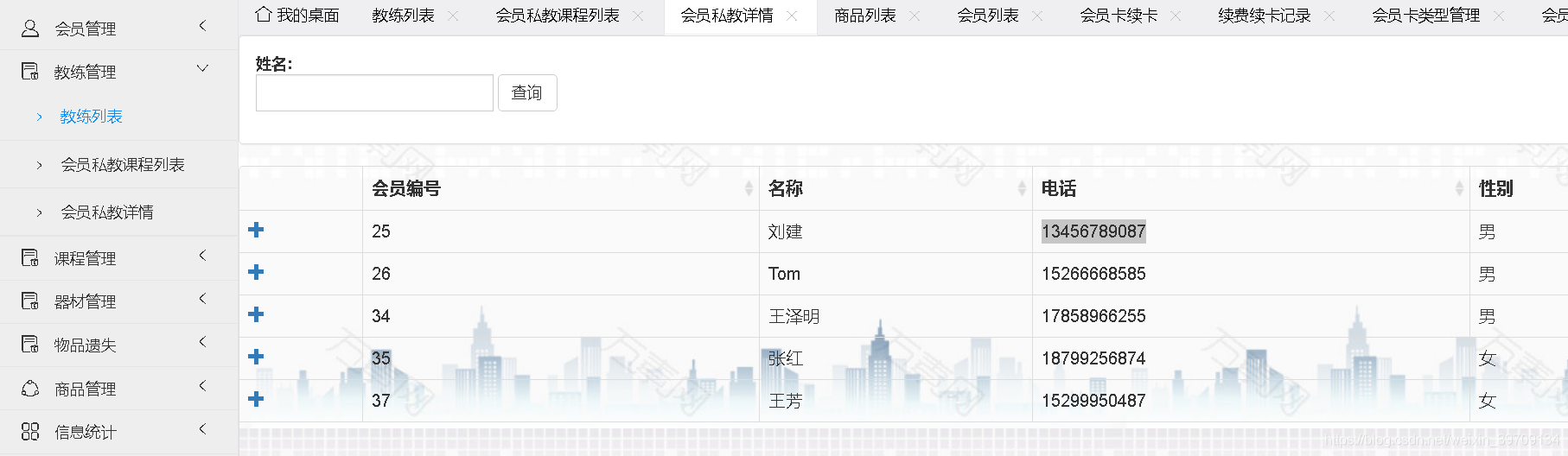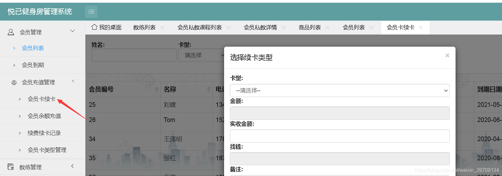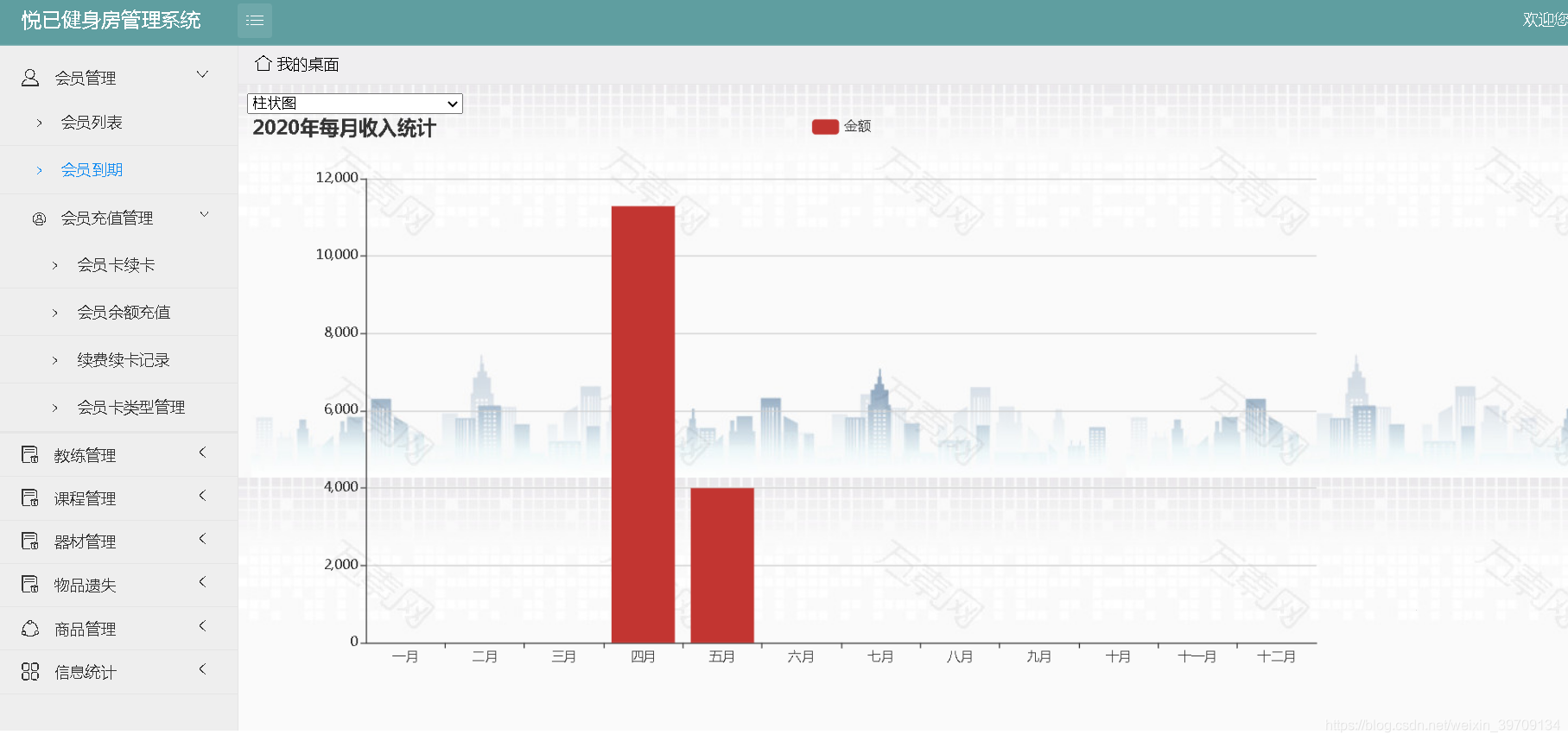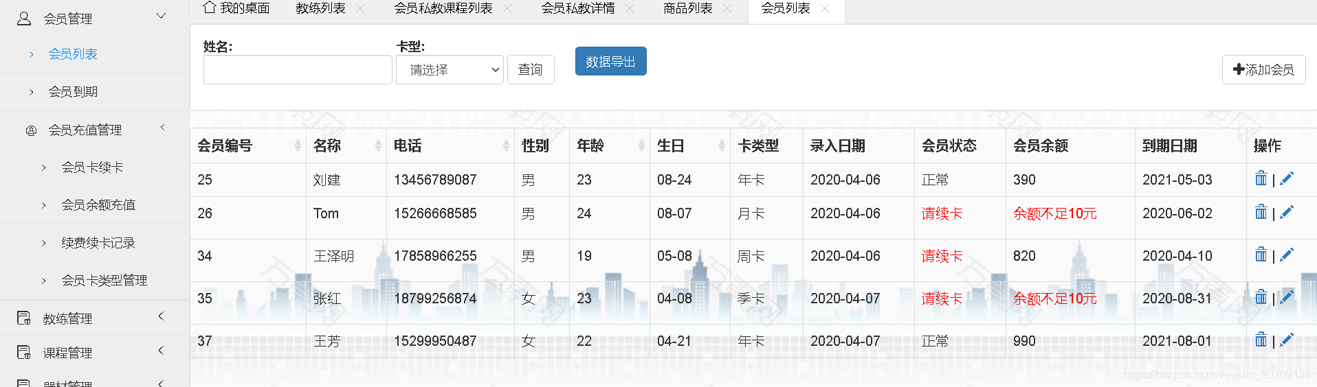 首页主要功能有:会员信息管理、会员到期续费管理、充值管理、教练课程管理、私教管理、器材管理、小商品售卖管理、信息统计、修改密码等主要功能